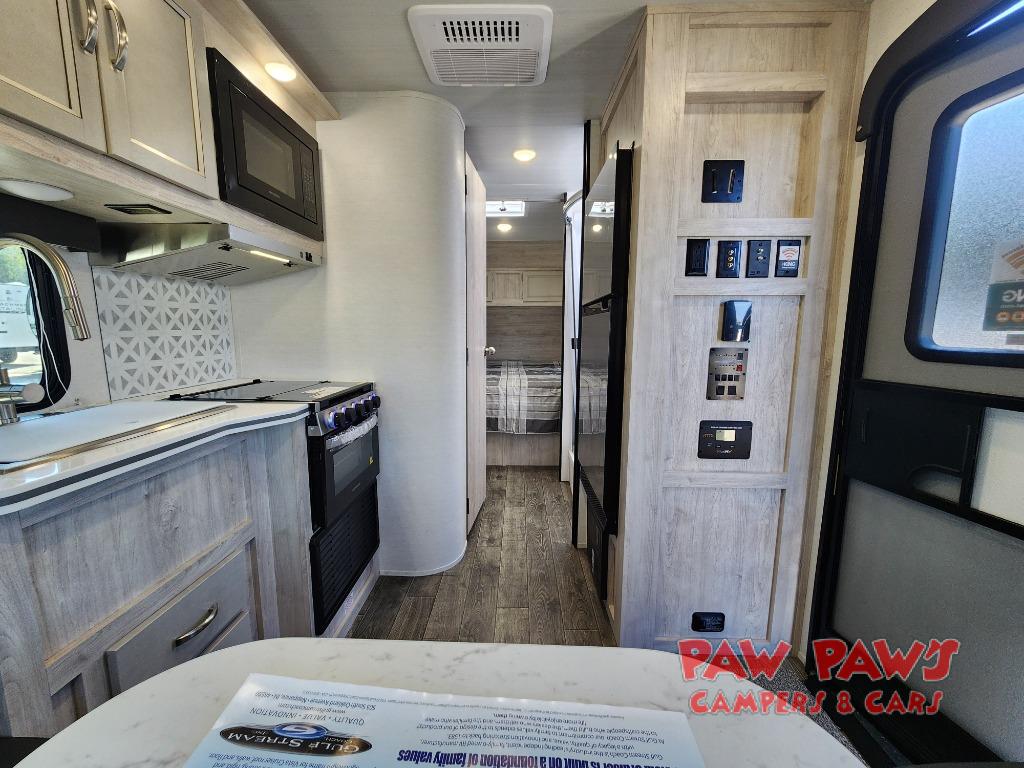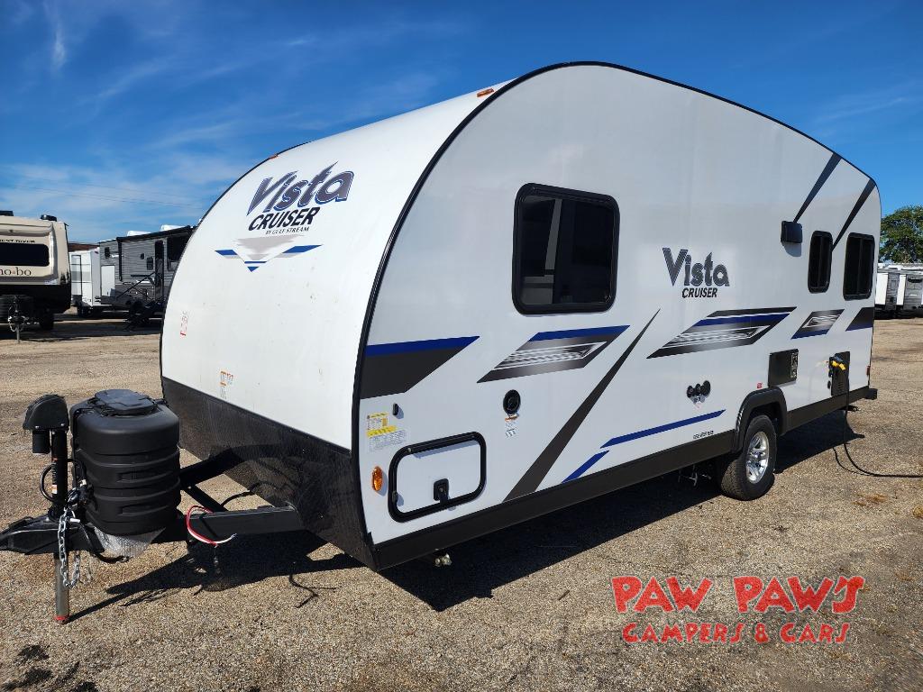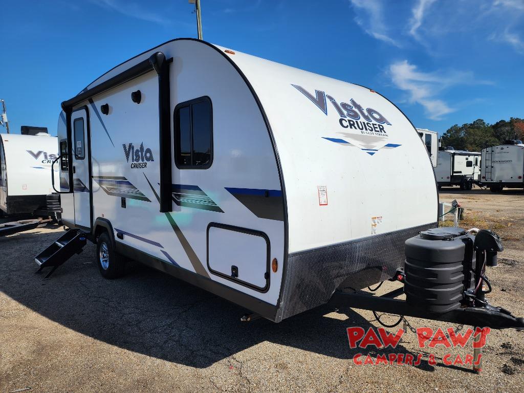 With any Vista Cruiser by Gulf Stream, you will enjoy premium quality in a compact and easy to tow travel trailer. The one-piece fiberglass roof, welded aluminum frame, and vacuum-bonded sidewalls with a composite barrier layer will create a strong and durable foundation to your RV. There are also LED running lights, along with an outside spray port, an electric awning, and a power tongue jack for easy set up. A home theater stereo with Bluetooth and speakers will allow you to listen to your favorite tunes, and there are interior and exterior TV mounting brackets if you decide to bring along a television. More interior features include "Opulence River Rock" wall vinyl, designer window treatments and night shades, tile backsplash at the range, and a premium foam mattress for your comfort.