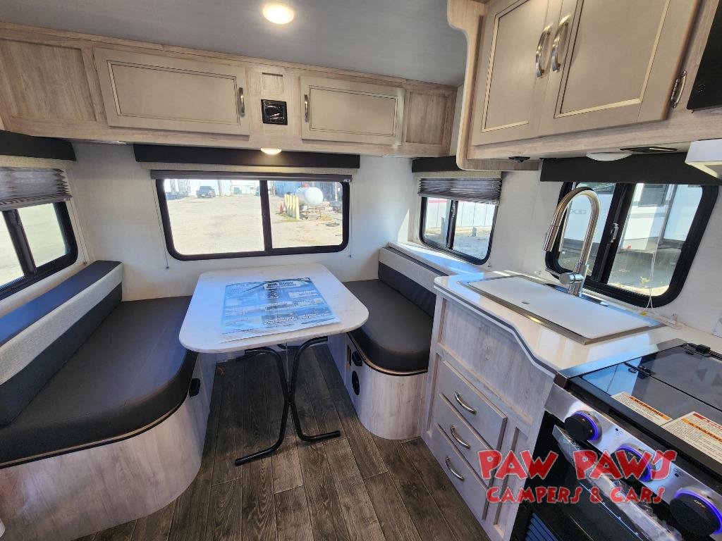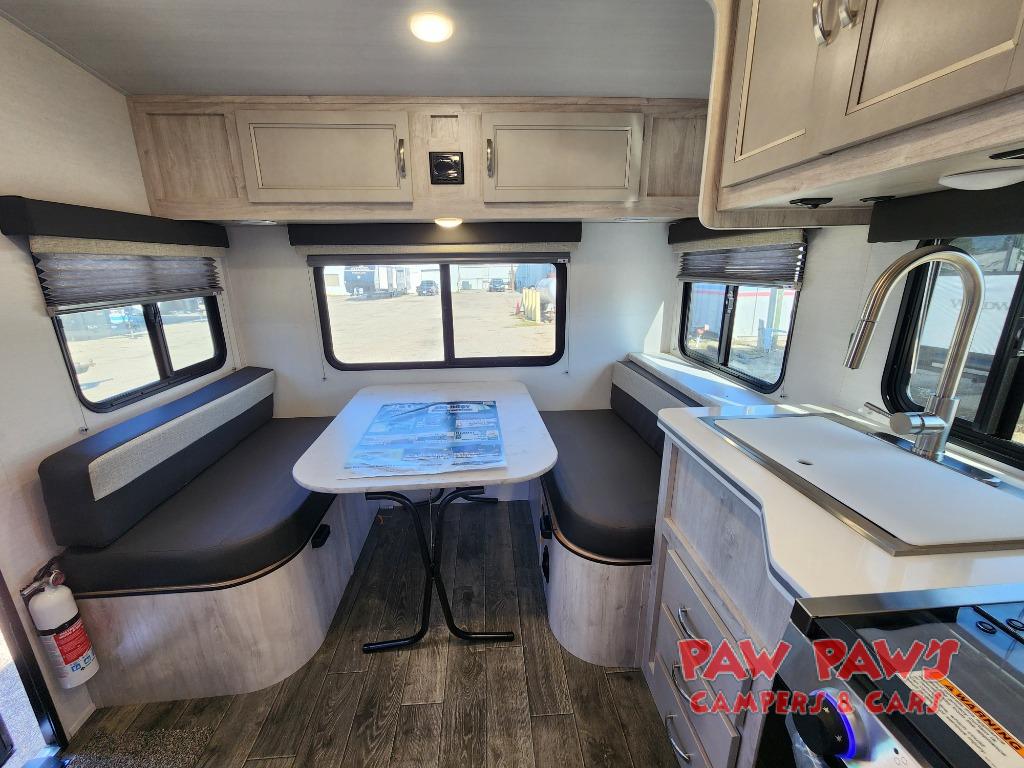 You will feel right at home in this travel trailer with the front queen bed that has privacy curtains to draw at night and shirt closets! The separated bathroom makes it easy for one to take a hot shower while another washes up for dinner. You can prepare delicious home cooked meals with the three burner cooktop and enjoy them at the rear booth dinette. The dinette can also transform into an extra sleeping space and there is a TV mount location diagonal to it also!