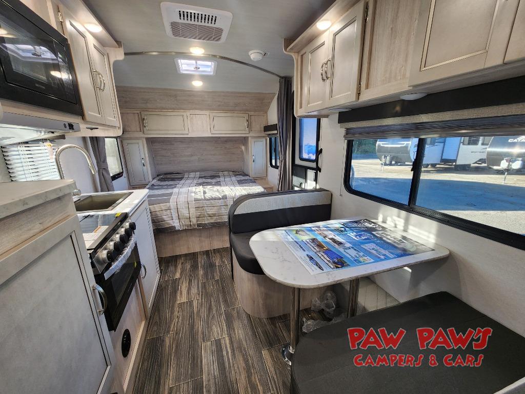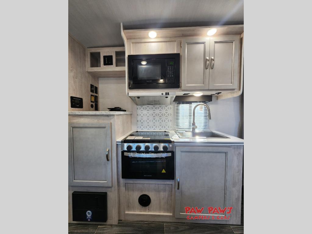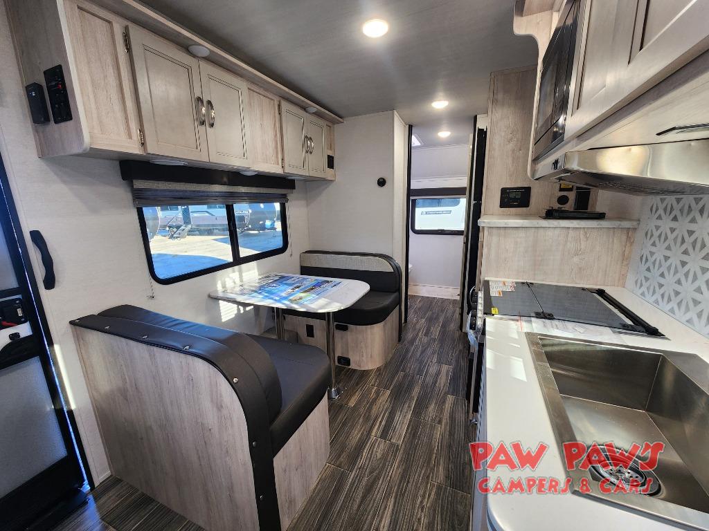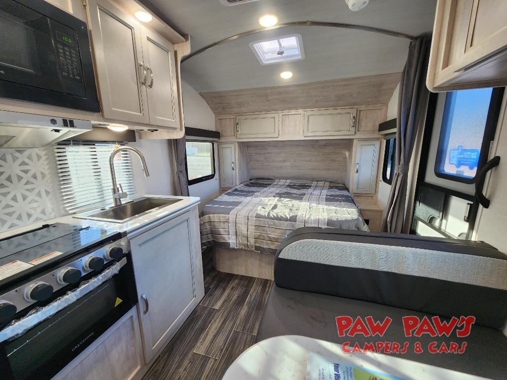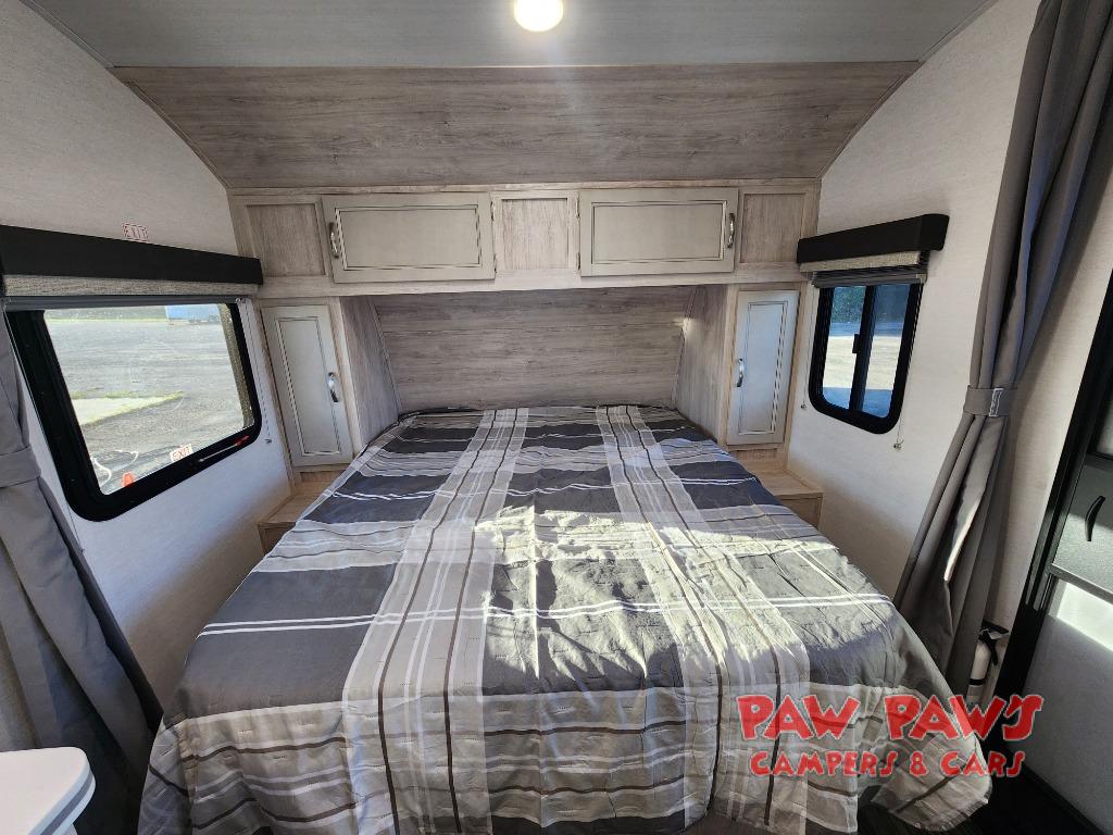 This travel trailer has the same layout as model 18MBS, but you'll enjoy a fixed RV queen bed up front instead of the Murphy bed. The full rear bath includes a linen closet and a wardrobe to keep your necessities organized, and you'll find additional storage throughout this model for your belongings. The vintage booth dinette will be the perfect place to dine at after dinner is made on the cooktop. There is also a microwave oven for quick meals and an 8 cu. ft. 12V refrigerator for cold drinks and perishables. And don't forget about the exterior pass-through storage for your larger camp gear!