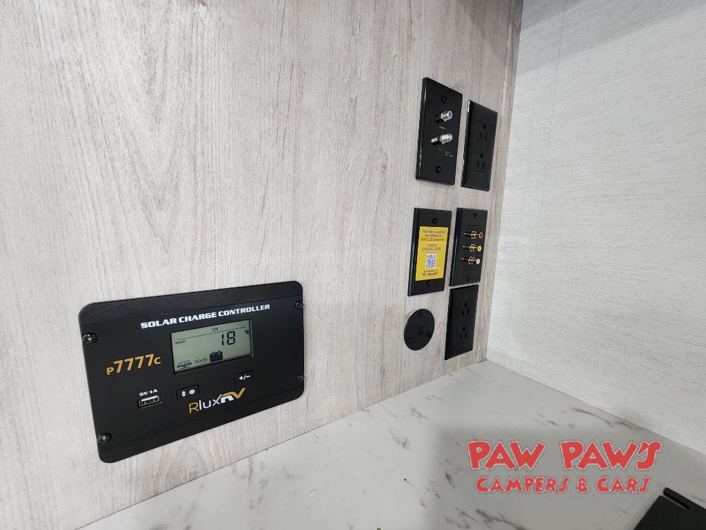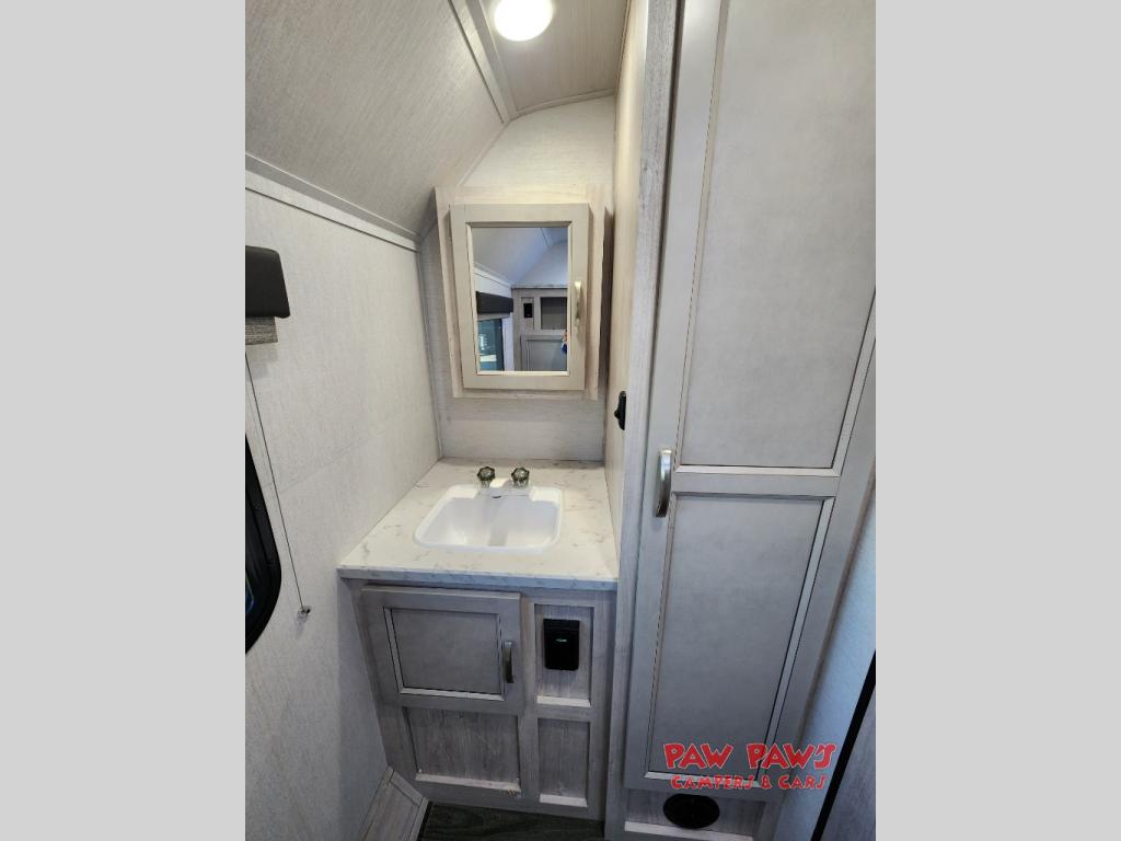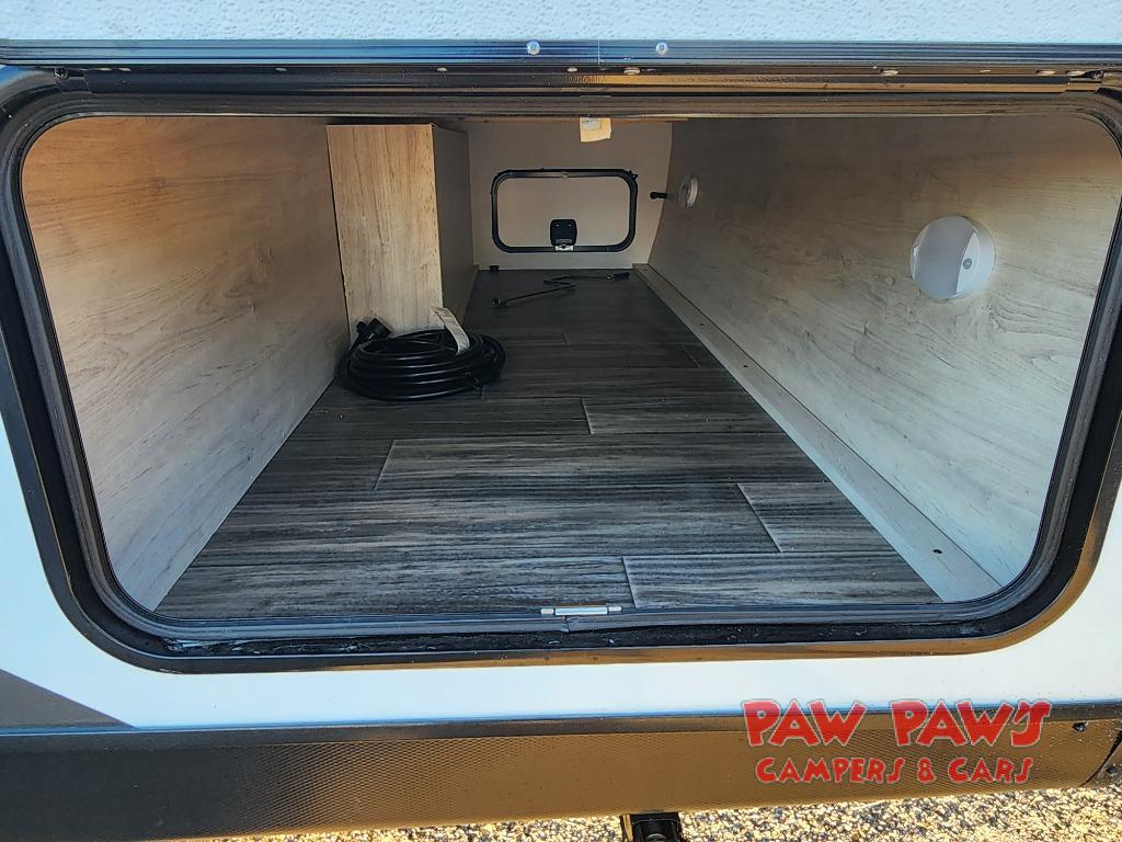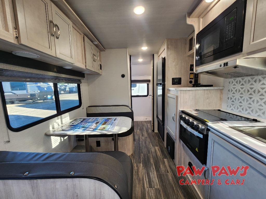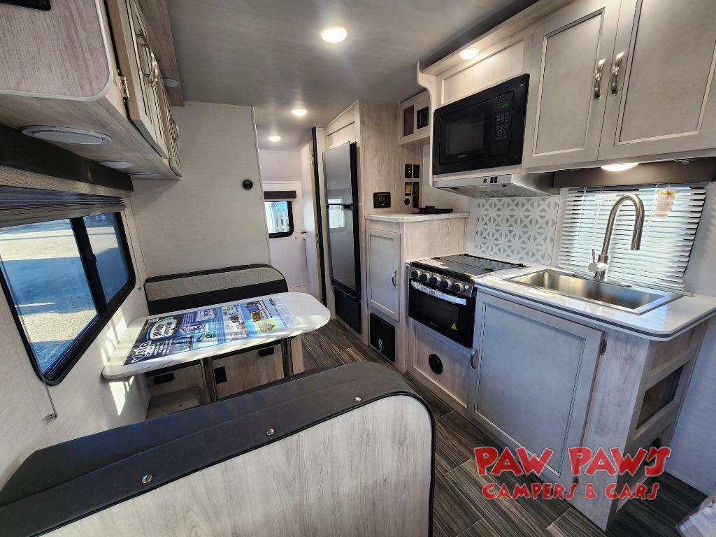 This travel trailer has the same layout as model 18MBS, but you'll enjoy a fixed RV queen bed up front instead of the Murphy bed. The full rear bath includes a linen closet and a wardrobe to keep your necessities organized, and you'll find additional storage throughout this model for your belongings. The vintage booth dinette will be the perfect place to dine at after dinner is made on the cooktop. There is also a microwave oven for quick meals and an 8 cu. ft. 12V refrigerator for cold drinks and perishables. And don't forget about the exterior pass-through storage for your larger camp gear!