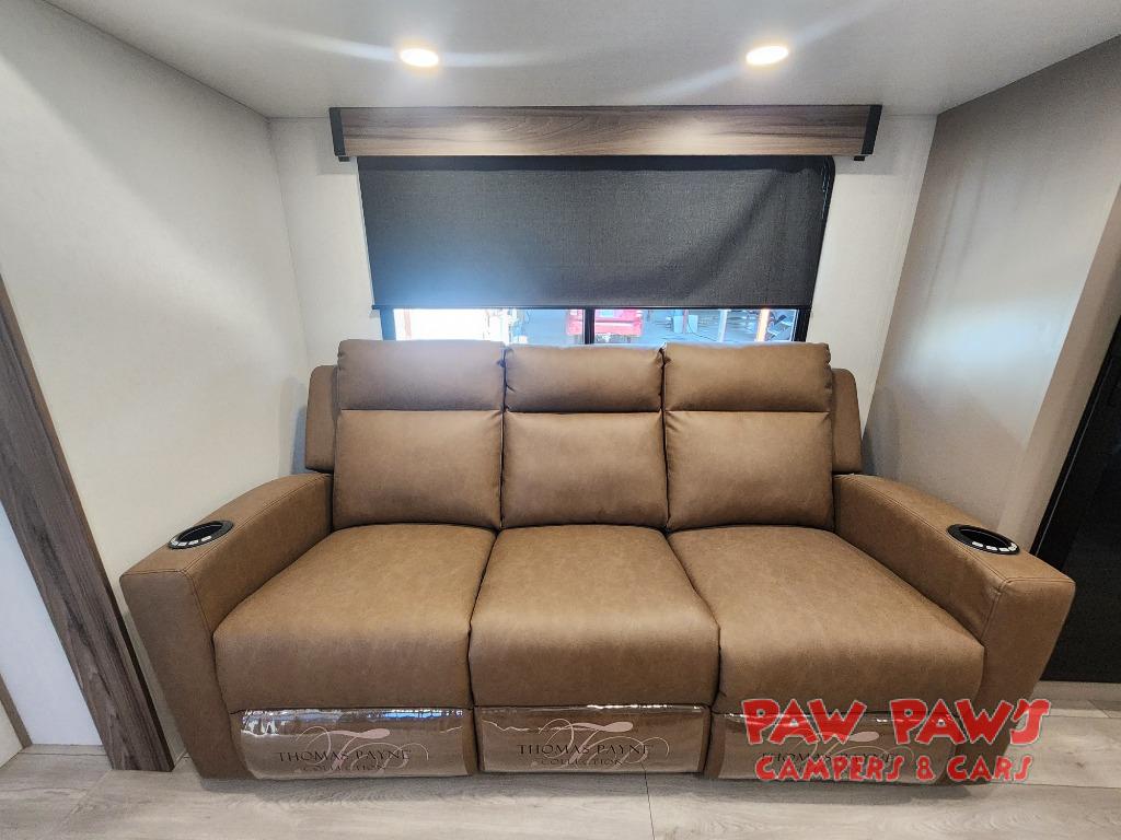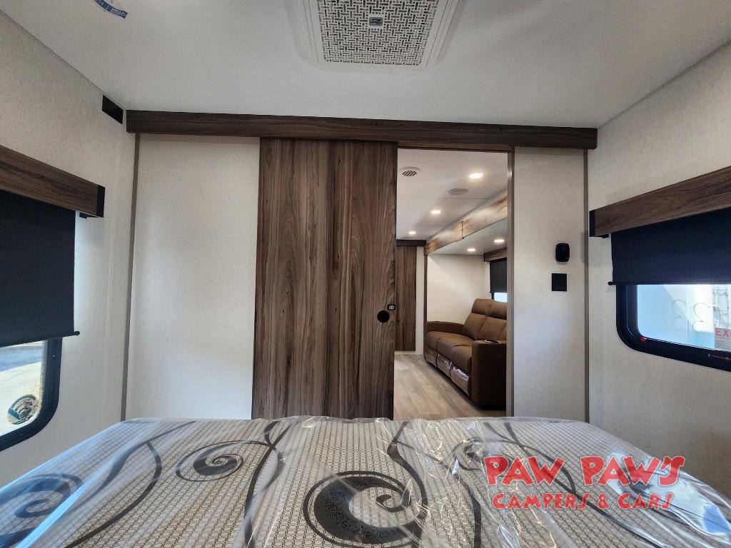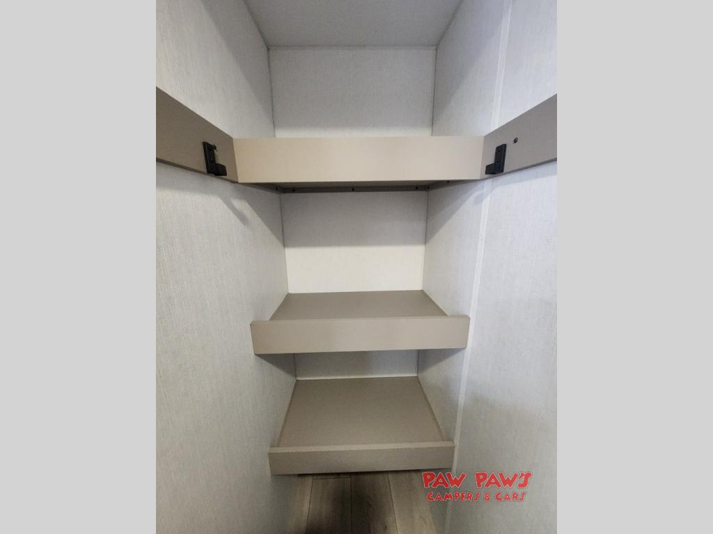 Inside comforts are found throughout this trailer from the theater dinette with a table and a 10 cu. ft. refrigerator within the slide out, to the rear full bathroom with a space saving door. Outside, you will find comfort under the 16' power awning while relaxing as you decide what to do next. The pass-through storage gives you a place for your larger items like camping chairs, portable stove, charcoal and outdoor games. The cook will love the L-shaped countertop and kitchen appliances, plus the walk-in pantry includes coat hooks. At night, head to the front to enjoy your own queen bed with clothing storage on each side, plus there is a TV mount if you want to add your own TV.