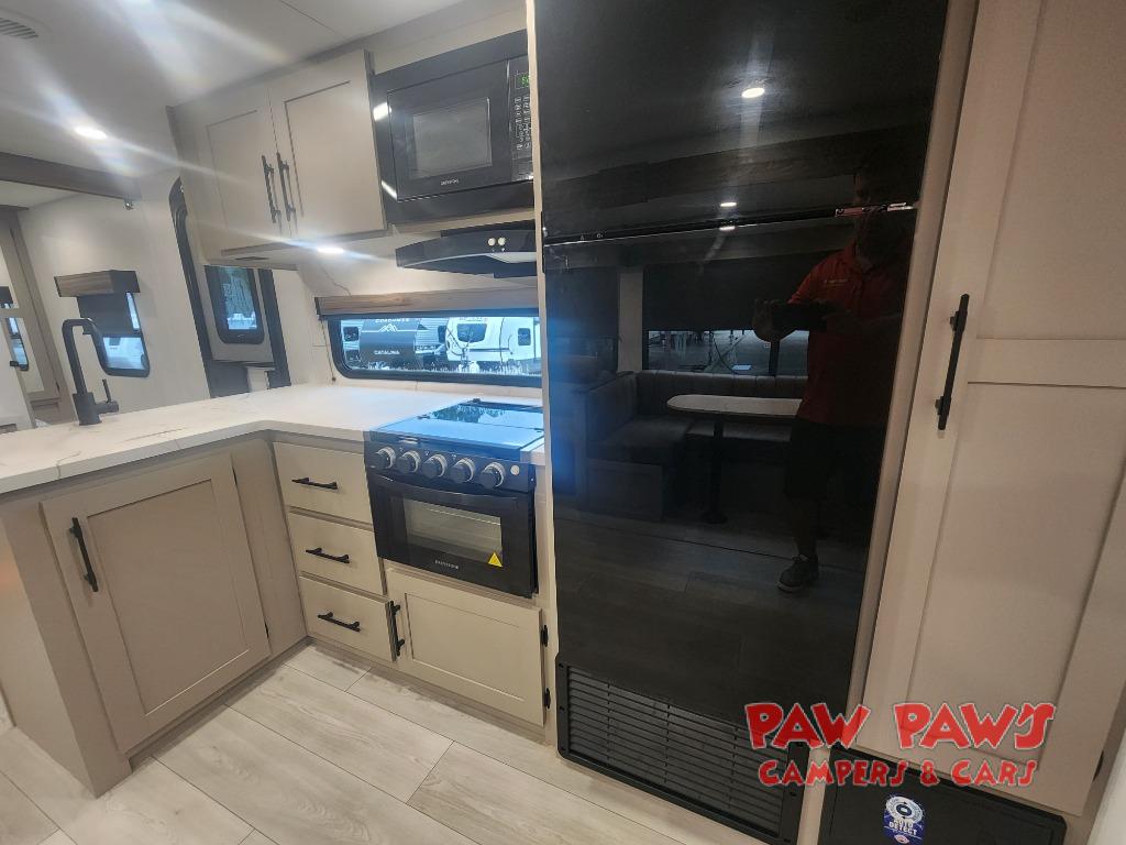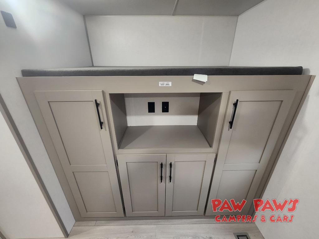 Your kids or your friends will love having their own privacy in the rear bunkhouse which offers two bunks and a dinette to play games or dine at, plus there is a closet for their storage. The full bathroom is conveniently located and includes the second exterior entry for quick and easy access to the fun happening outside. You will have your own private bedroom on the opposite side of the trailer, and it includes a walk-around queen bed, dual wardrobes and a sliding entry door. The main living and kitchen area is spacious with a large slide out, and you can relax on the 64" sofa or the 80" U-shaped dinette while the cook makes meals with full amenities including a 10 cu. ft. 12V refrigerator and a pantry for food storage.