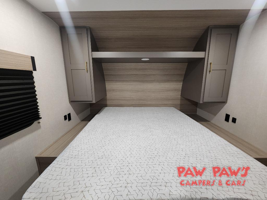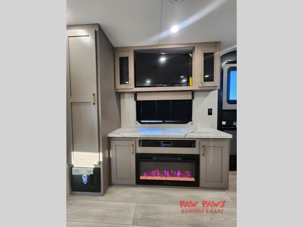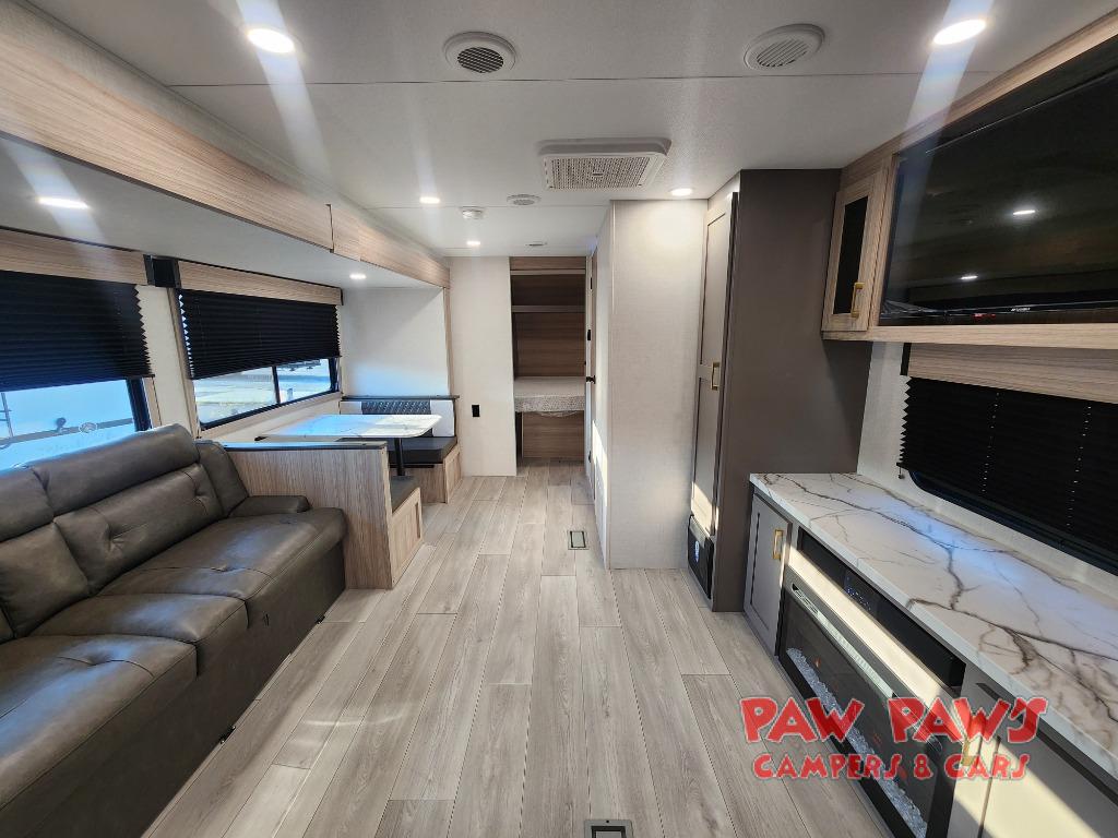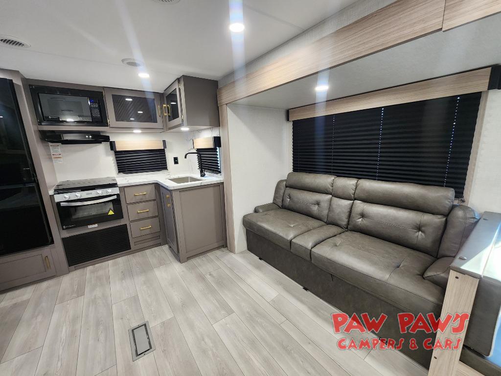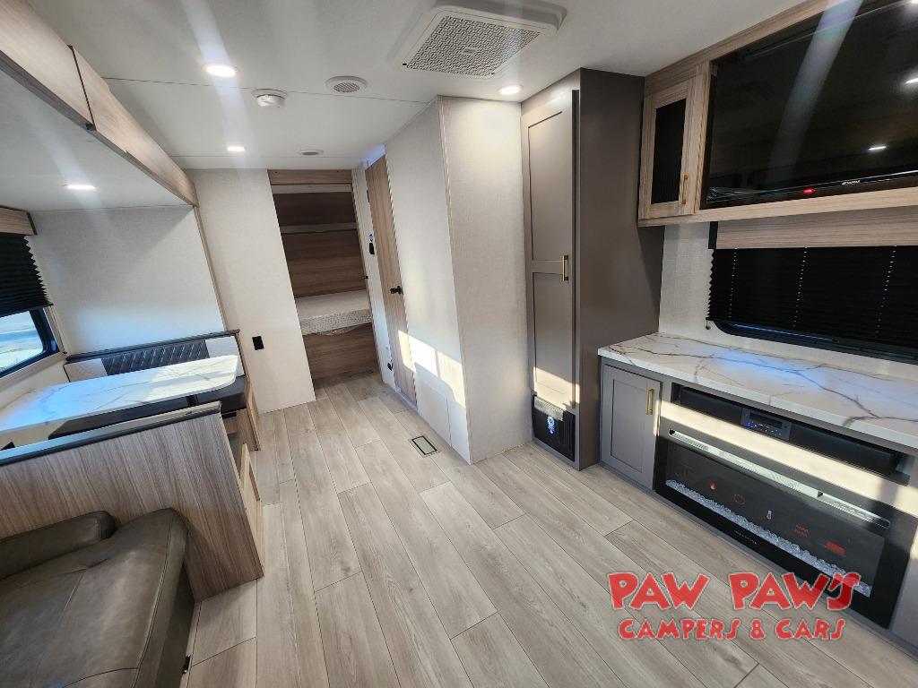 You will love the amount of interior space you have in this travel trailer thanks to the large slide out and rear kitchen with plenty of counter space. There is a 70" sofa and 42" booth dinette within the slide out across from the entertainment center, and you can add the optional 30" fireplace here for more comfort. The full bath includes a bath shelf with towel hooks, plus a foot-flush toilet for convenience. You will feel right at home in the front private bedroom that includes a queen bed, dual shirt closets, plus a TV mount if you choose to bring along a television.