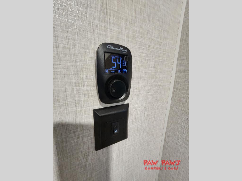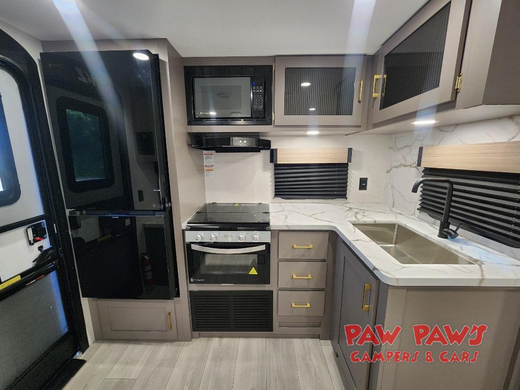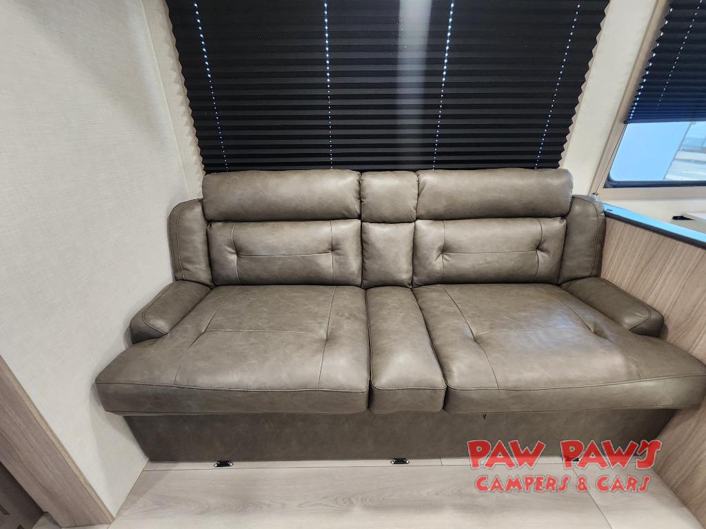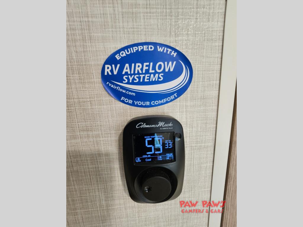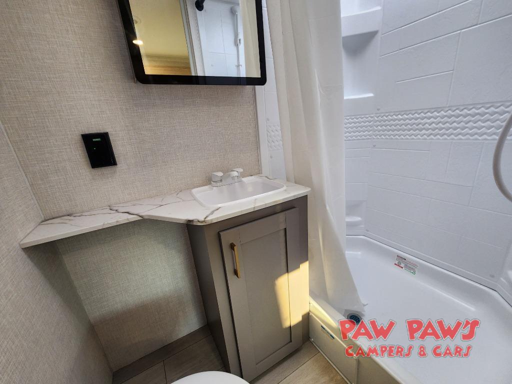 You will love the amount of interior space you have in this travel trailer thanks to the large slide out and rear kitchen with plenty of counter space. There is a 70" sofa and 42" booth dinette within the slide out across from the entertainment center, and you can add the optional 30" fireplace here for more comfort. The full bath includes a bath shelf with towel hooks, plus a foot-flush toilet for convenience. You will feel right at home in the front private bedroom that includes a queen bed, dual shirt closets, plus a TV mount if you choose to bring along a television.