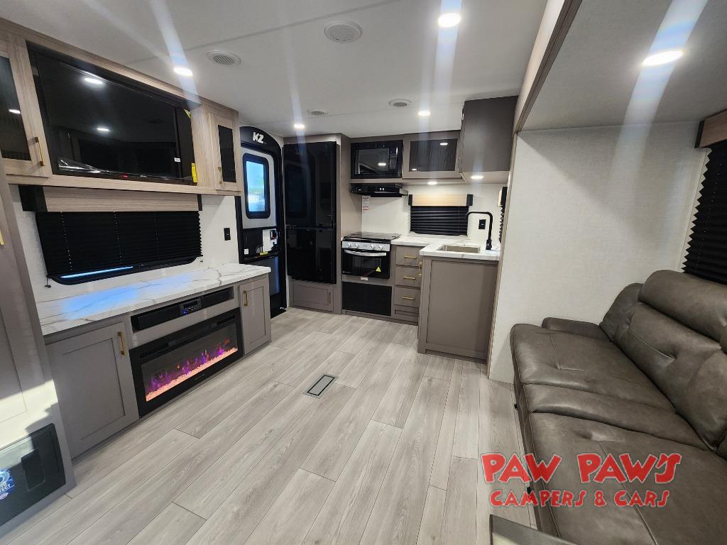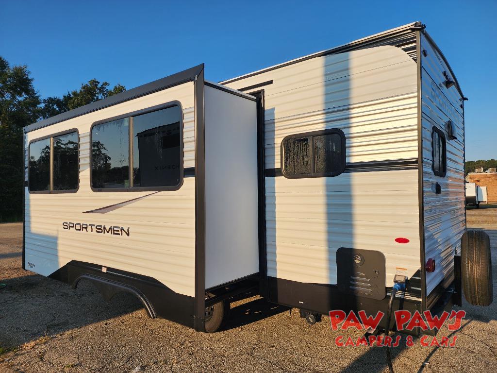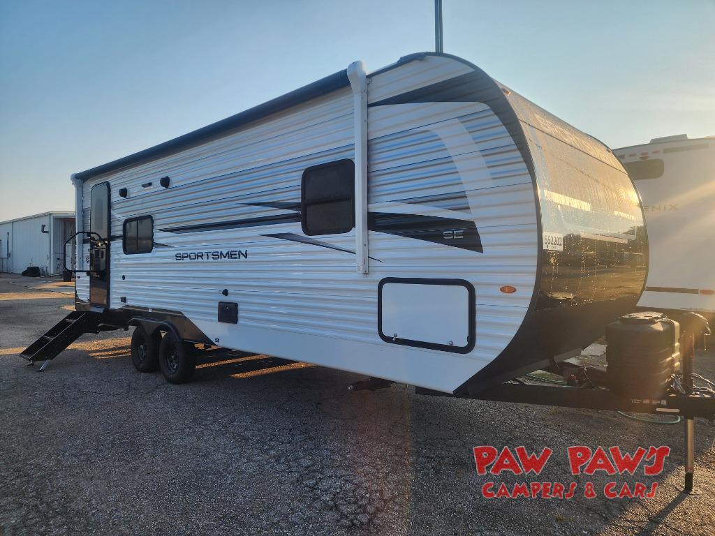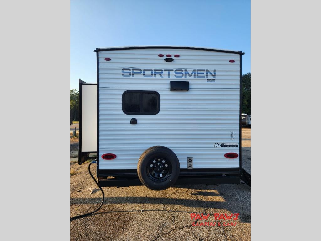 Each Sportsmen SE travel trailer by KZ is constructed with KZ exclusive tough shield exterior metal, a one-piece seamless walk-on Tufflex roofing material, and diamond plate rock guard to protect your unit from road debris. You will appreciate the extra large baggage doors for stowing away your gear when not in use, and tinted windows to help keep the harmful sun rays out plus keeping it cooler inside. Some of the exterior conveniences found in the mandatory Advantage Package are the solid folding steps with a large folding grab handle for easy entry and exit, a full glass friction hinged entry door, plus an exterior shower for your pets or to rinse off before you head inside. You'll also appreciate the nitrogen-filled tires, solar and backup camera prep, plus a Leash Latch with a bonus beverage opener. You'll feel right at home inside with linoleum flooring throughout, a 13,500 BTU air conditioner, large overhead cabinets, a shower surround, and much more!