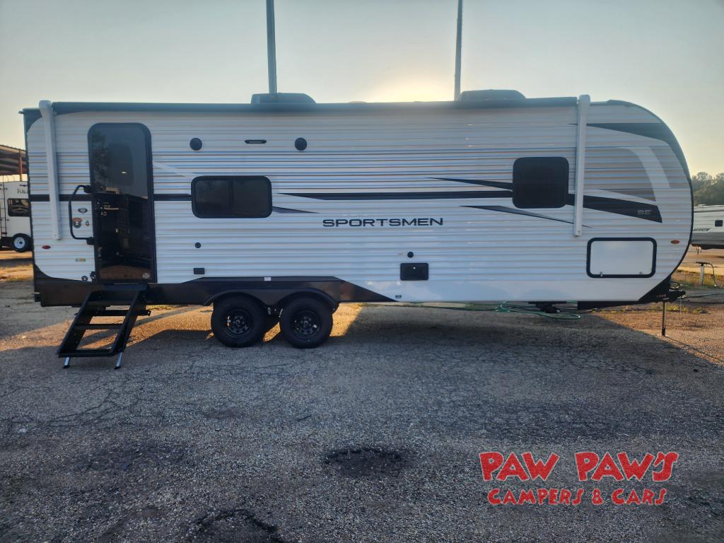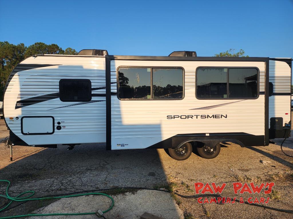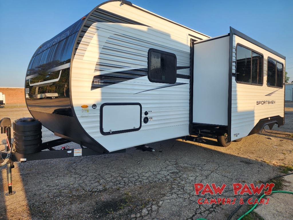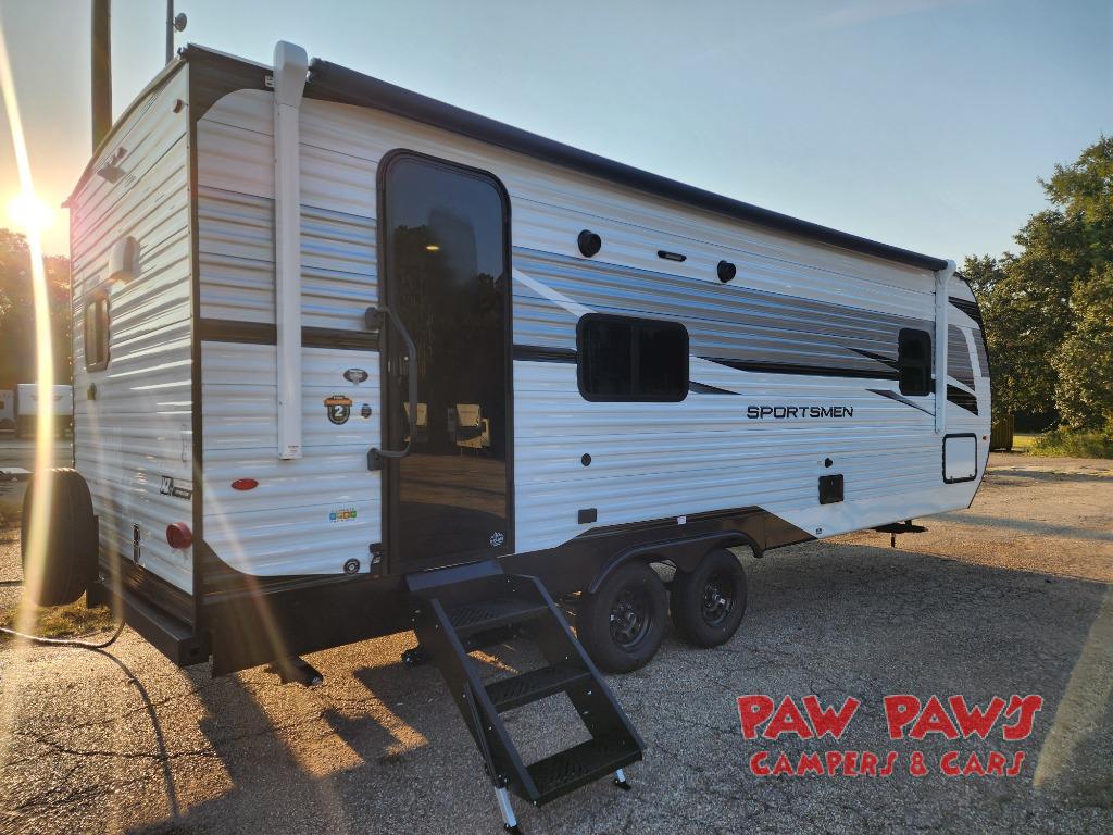 Each Sportsmen SE travel trailer by KZ is constructed with KZ exclusive tough shield exterior metal, a one-piece seamless walk-on Tufflex roofing material, and diamond plate rock guard to protect your unit from road debris. You will appreciate the extra large baggage doors for stowing away your gear when not in use, and tinted windows to help keep the harmful sun rays out plus keeping it cooler inside. Some of the exterior conveniences found in the mandatory Advantage Package are the solid folding steps with a large folding grab handle for easy entry and exit, a full glass friction hinged entry door, plus an exterior shower for your pets or to rinse off before you head inside. You'll also appreciate the nitrogen-filled tires, solar and backup camera prep, plus a Leash Latch with a bonus beverage opener. You'll feel right at home inside with linoleum flooring throughout, a 13,500 BTU air conditioner, large overhead cabinets, a shower surround, and much more!