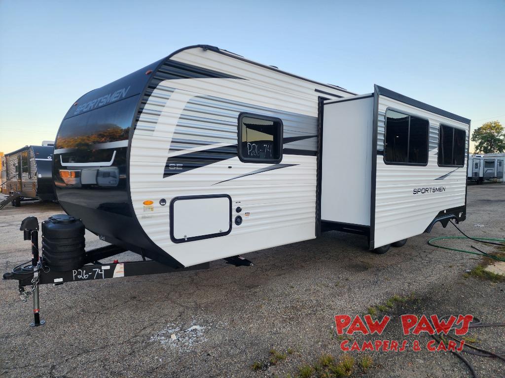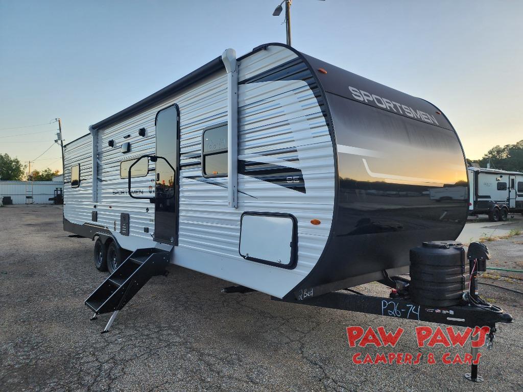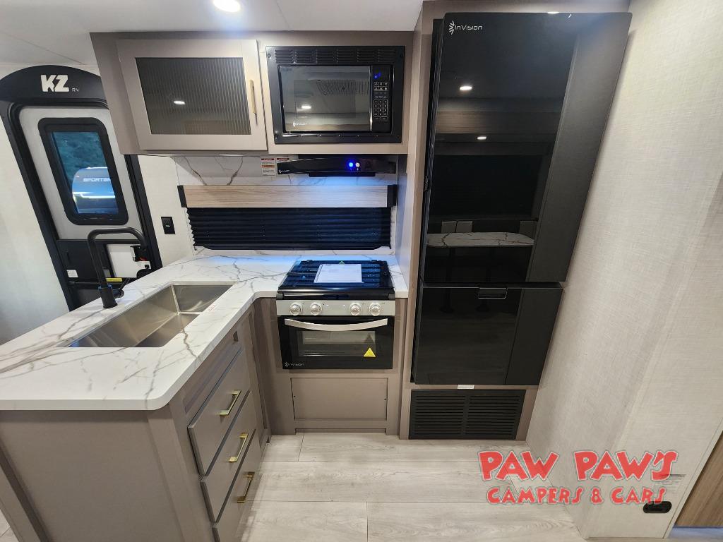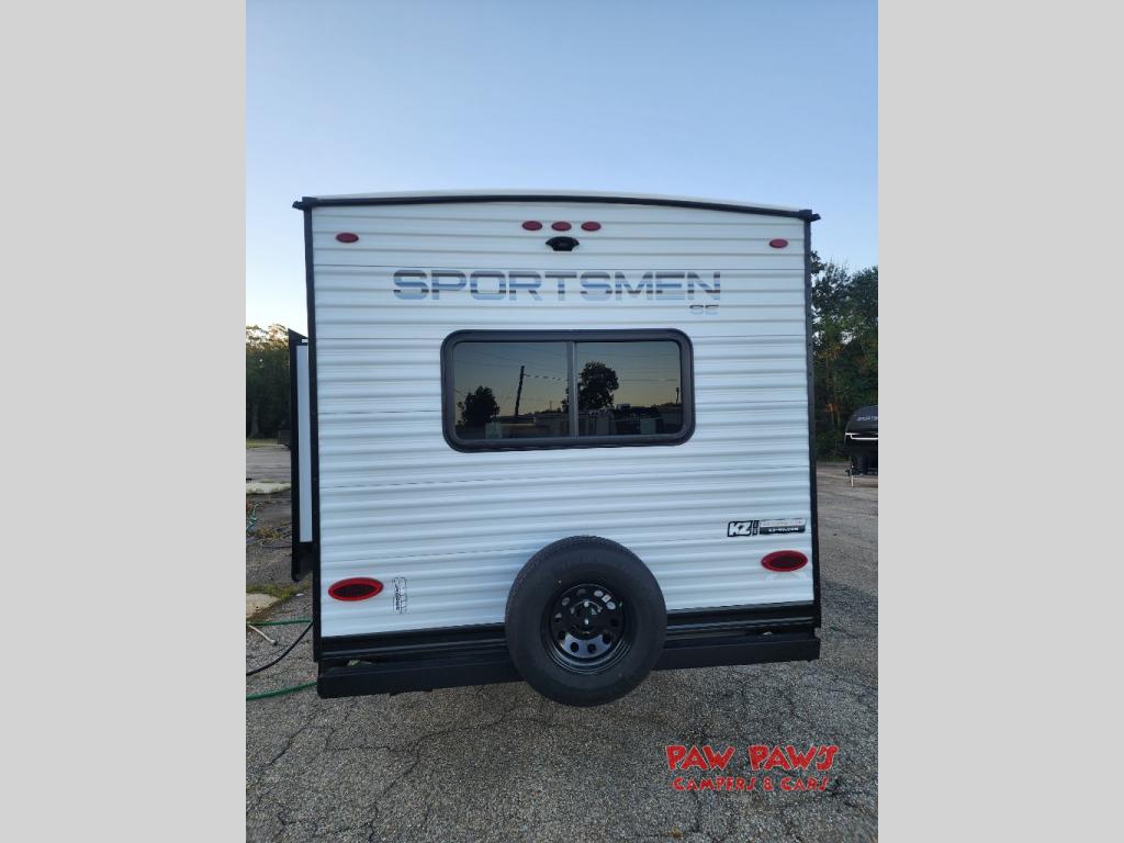 Each Sportsmen SE travel trailer and toy hauler by KZ is constructed with KZ exclusive tough shield exterior metal, a one-piece seamless walk-on Tufflex roofing material, and diamond plate rock guard to protect your unit from road debris. You will appreciate the extra large baggage doors for stowing away your gear when not in use, and tinted windows to help keep the harmful sun rays out plus keeping it cooler inside. Some of the exterior conveniences found in the mandatory Advantage Package are the solid folding steps with a large folding grab handle for easy entry and exit, a full glass friction hinged entry door, plus an exterior shower for your pets or to rinse off before you head inside. You'll also appreciate the nitrogen-filled tires, solar and backup camera prep, plus a Leash Latch with a bonus beverage opener. You'll feel right at home inside with linoleum flooring throughout, a 13,500 BTU air conditioner, large overhead cabinets, a shower surround, and much more!