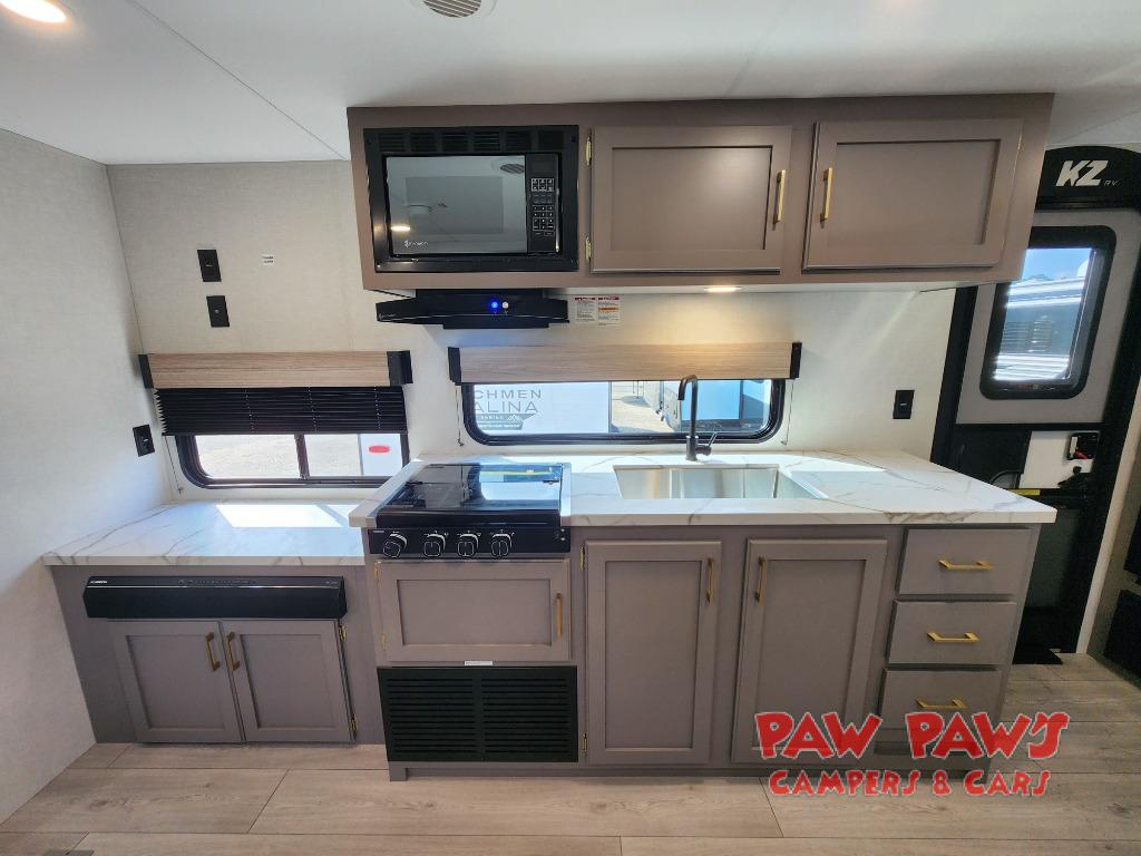 With any Sportsmen Select travel trailer by KZ, you will enjoy premium features at an affordable price, making them perfect for rookie RVers! Each model is constructed with an aerodynamic front profile with a smooth metal front for better fuel efficiency, and the nitrogen filled tires and power tongue jack will make towing easier than ever. There is also a Key-Alike system for entry and baggage doors to keep your belongings secure, plus backup camera prep and solar roof prep means you can easily add these features to make camping that much smoother. An omnidirectional HDTV antenna with Wi-Fi prep will give you the option to stay connected as you camp, and a multi-media sound bar stereo with Bluetooth, HDMI and USB charge will ensure you'll never go bored on rainy days. The interior of these travel trailers include seamless countertops with a deep undermount stainless steel kitchen sink, a black residential kitchen faucet, wider pocket/passage doors, and residential grade linoleum.