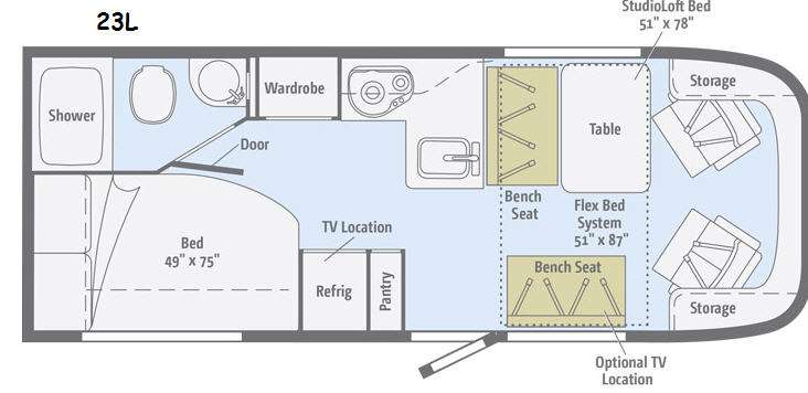 This Winnebago Trend Class C gas motor home model 23L features a rear bath and bed, plus a Studio Loft Bed, and Flex Bed System also!