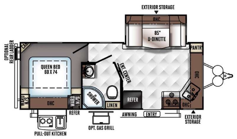 Outside fix quick snacks at the exterior pull-out kitchen which has a two burner range, and sink. Also find an optional gas grill and rear ladder and more!