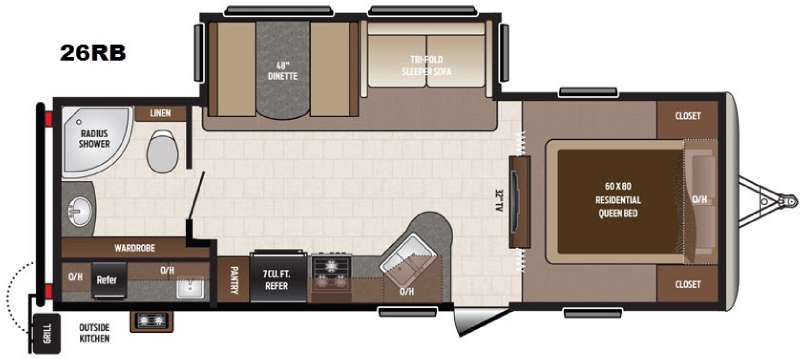 Step inside and see a 32" TV straight ahead. There is a front residential queen bed with closets on either side of the bed, plus overhead storage as well. There are accordion doors on either side of the entertainment center that can be closed for more privacy at night.