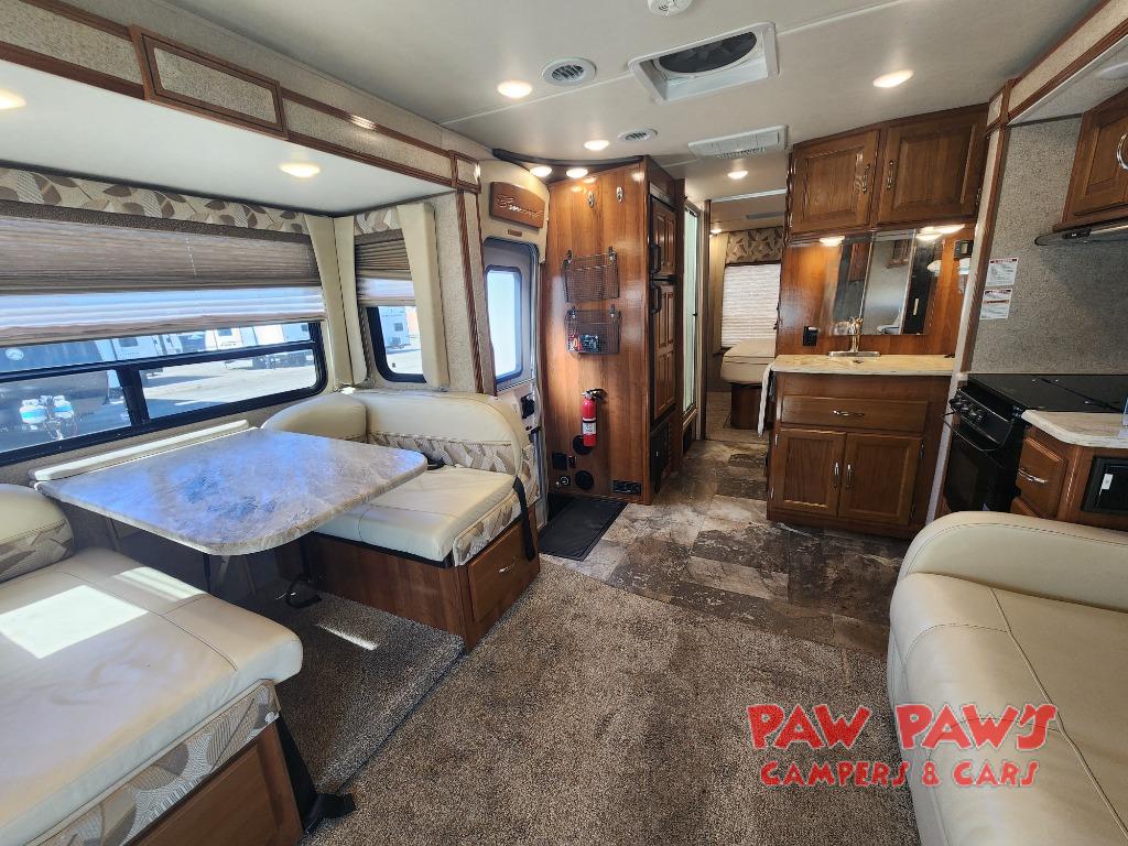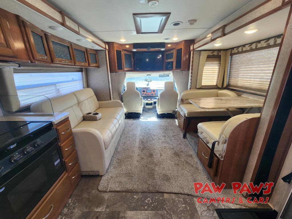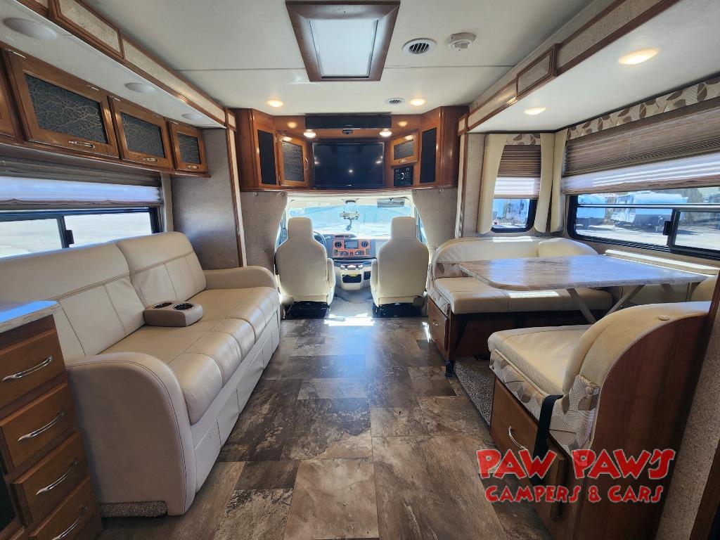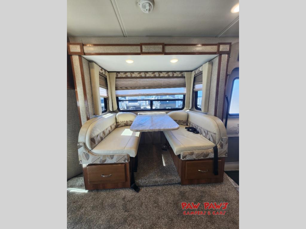 Step inside and find a wide open interior with dual opposing slides fully extended. There is a booth dinette slide to your immediate right as you enter. Enjoy the entertainment center with 32" TV found above the cab area when relaxing inside. The second slide out, opposite the door, features a comfortable sofa with overhead storage, and a three burner range for cooking meals at.