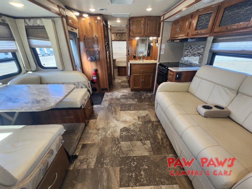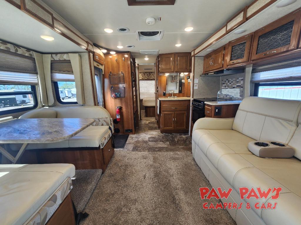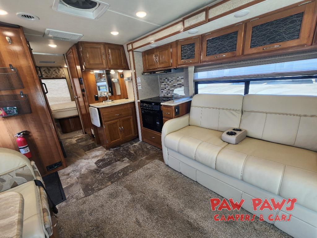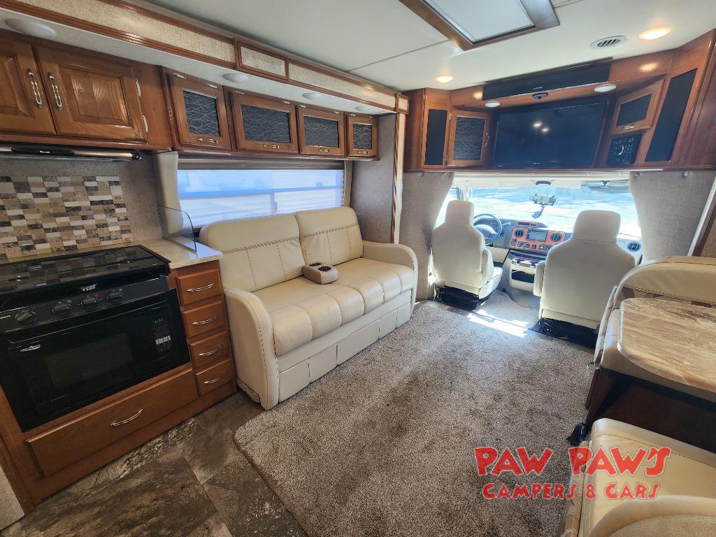 Step inside and find a wide open interior with dual opposing slides fully extended. There is a booth dinette slide to your immediate right as you enter. Enjoy the entertainment center with 32" TV found above the cab area when relaxing inside. The second slide out, opposite the door, features a comfortable sofa with overhead storage, and a three burner range for cooking meals at.