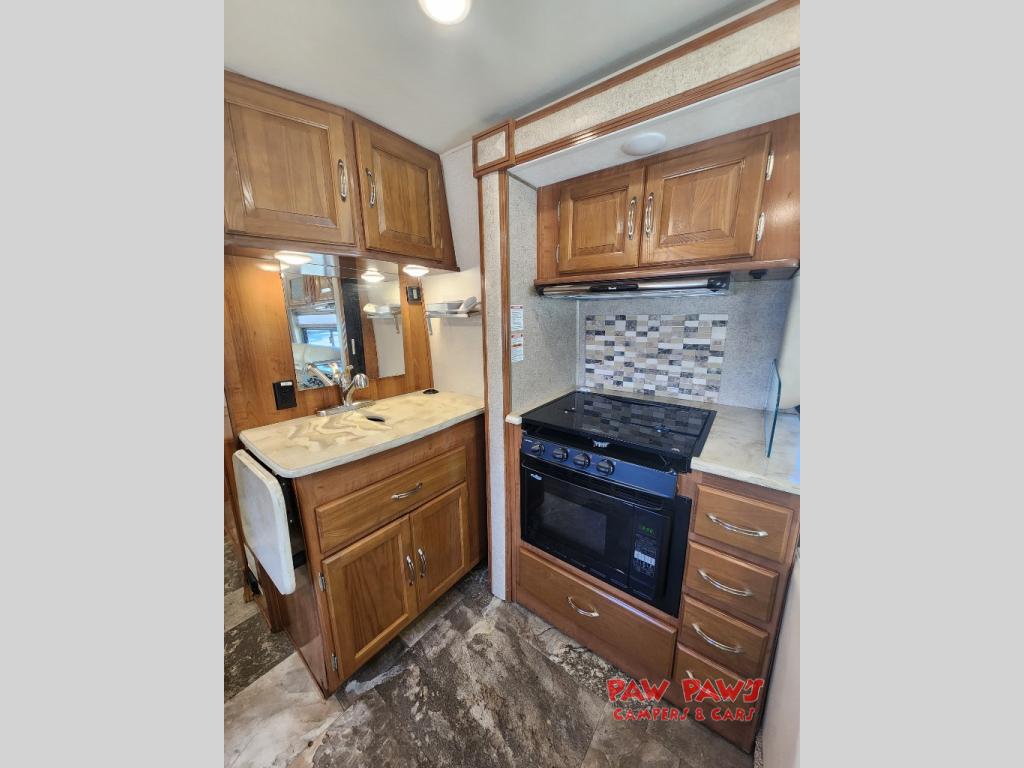 Just off the sofa and range slide out there is a counter space with a round single sink for cleaning up, overhead cabinets for your dishes, and a countertop extension if needed. The refrigerator is located across the aisle along the curb side wall near the entry door.