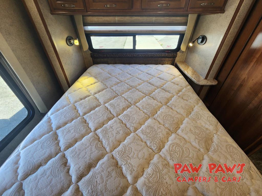 Head into the rear bedroom where you can rest up for another day of adventure easily. There is a slide out queen size bed with nightstand and storage along the road side, along with overhead cabinets for your things. There is also a dresser opposite for clothing storage, and a space for an optional 24" TV if you choose to add.