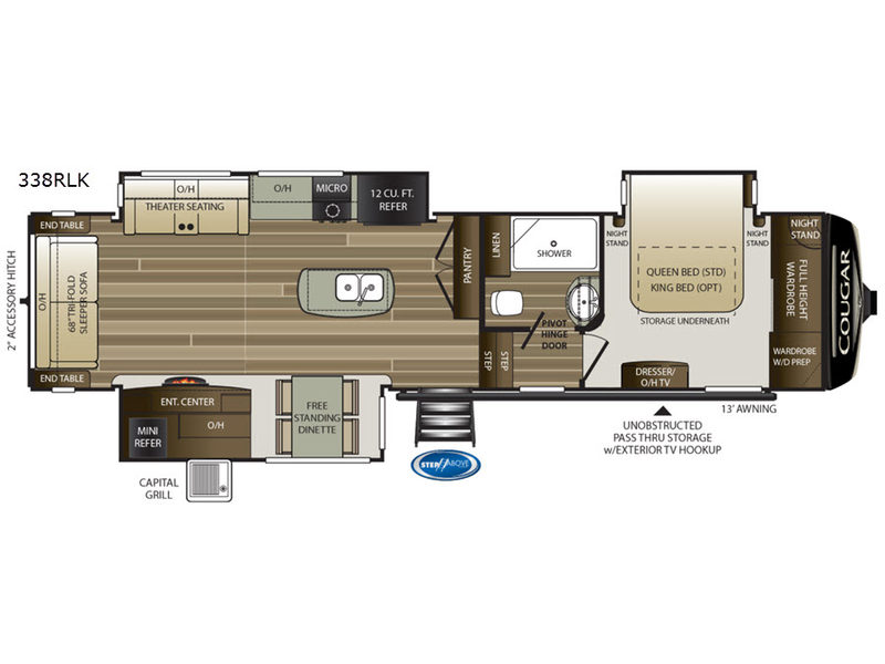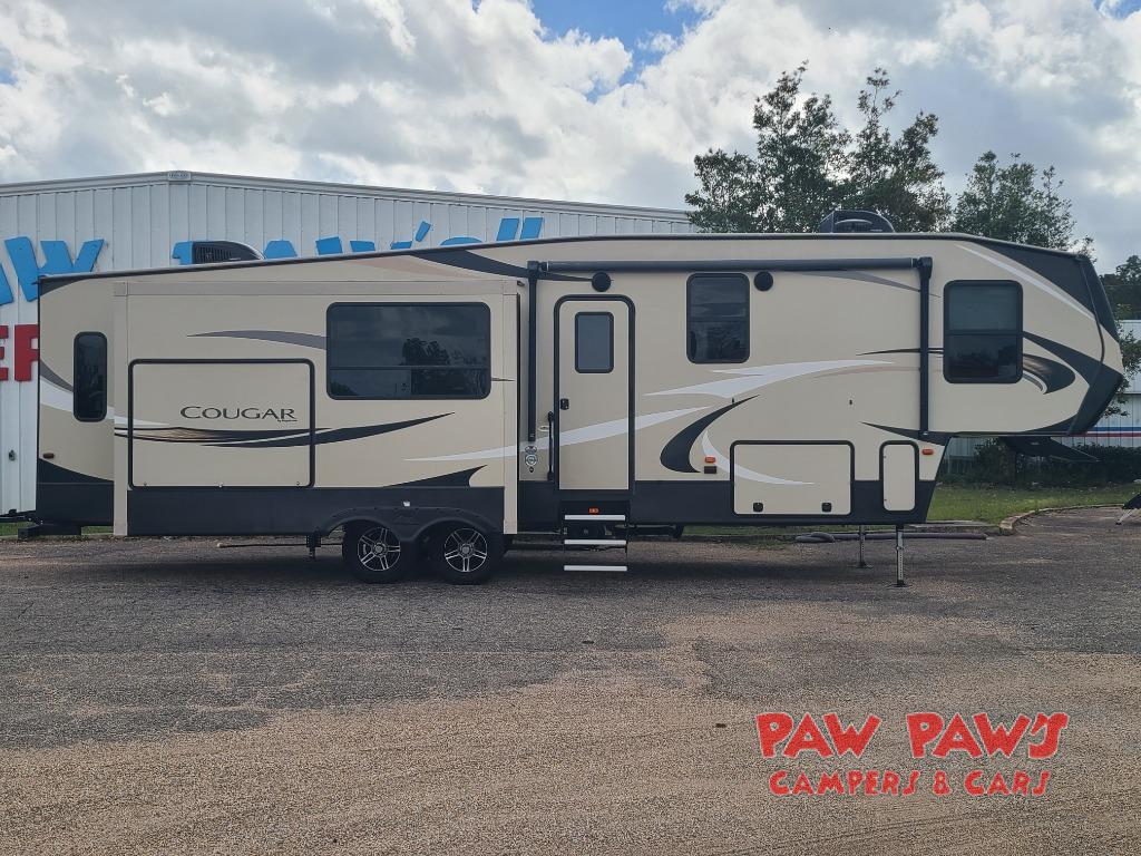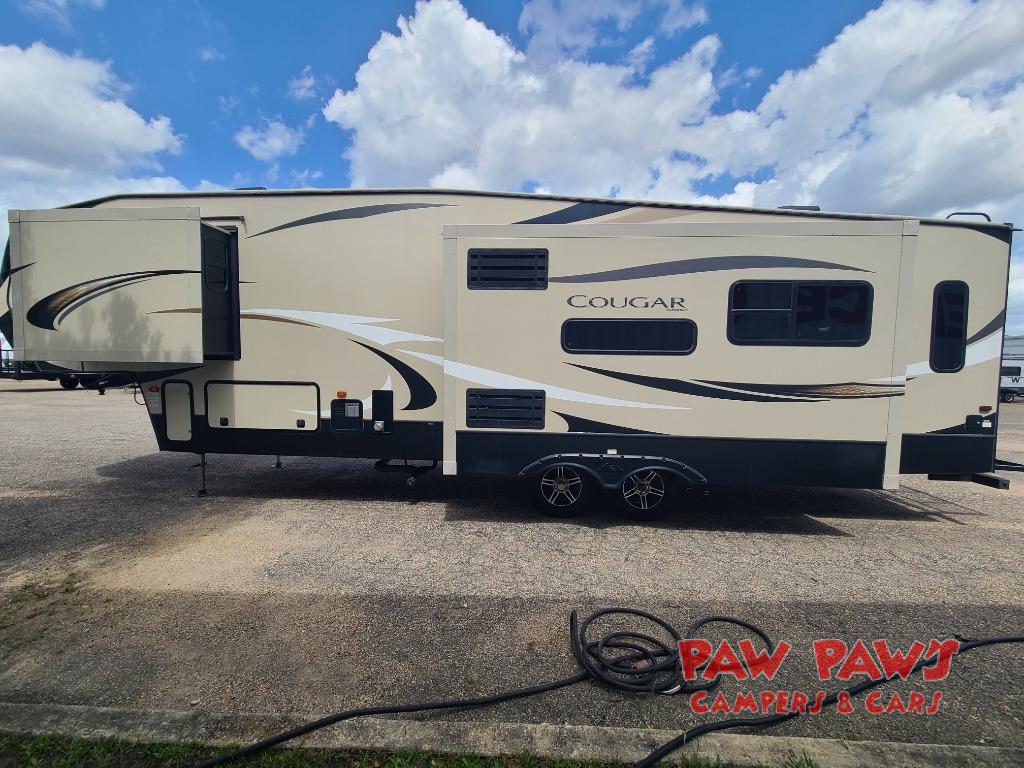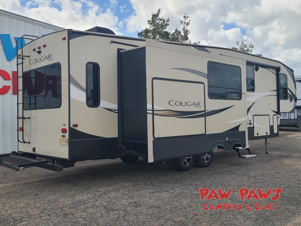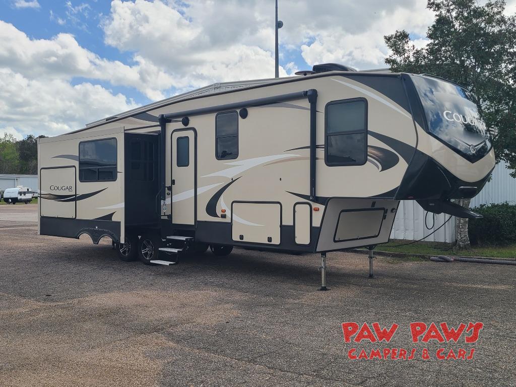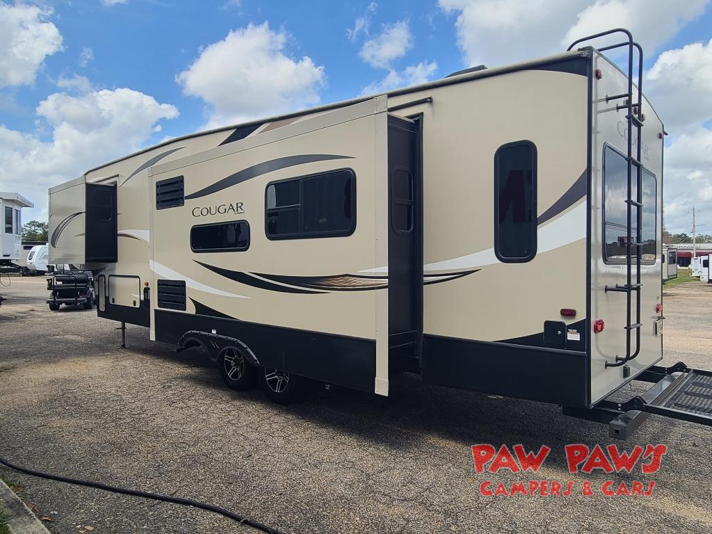 Looking for a couples trailer with extra sleeping space for the grandkids? When you travel do you enjoy grilling when you get a chance? This Cougar fifth wheel might just fit your needs and wants. From a push of the button to open up triple slides for more interior floor space to a pivot hinge bathroom door as an added convenience, you will find lots to love about this RV. After having fun outdoors, you can return to a full bathroom to get cleaned up, and comfortable furniture to watch TV with a fireplace below. The master bedroom will not disappoint. You will find plenty of storage throughout the interior including inside the large pantry, inside the linen cabinet in the bathroom, and the front bedroom's full height wardrobe or dresser. Outside, the unobstructed pass-through storage allows you to bring along golf clubs, outdoor camping chairs or tables, and such. Take a look today!