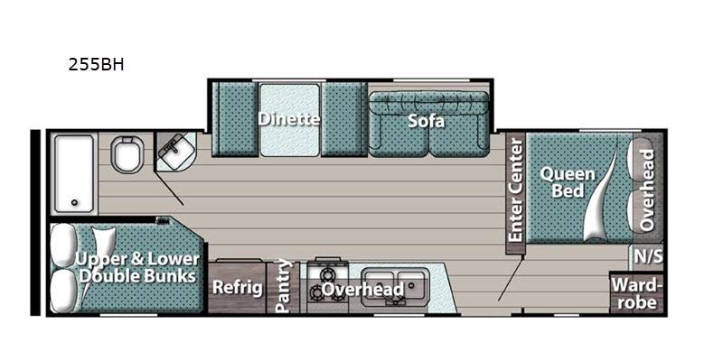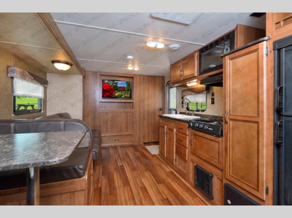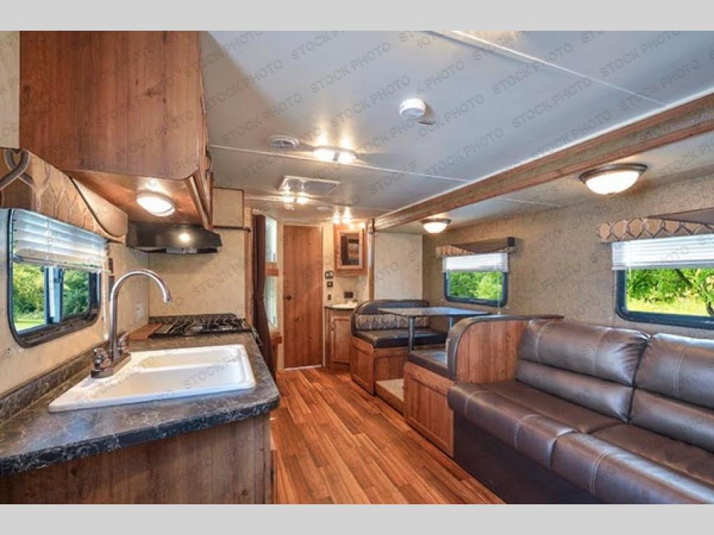 Let the fun begin with this travel trailer in tow! Once you arrive at your destination, prepare lunch on the three burner gas range and enjoy it at the booth dinette or take your plate outside to sit under the electric awning. After hiking or biking all day, you can clean up with your own bath amenities before heading off to bed. The kids will surely claim the double bunk beds as their own, and you and your spouse will get a great night's rest on the queen bed. This model also includes plenty of storage space, including a pantry for dry goods or snacks!