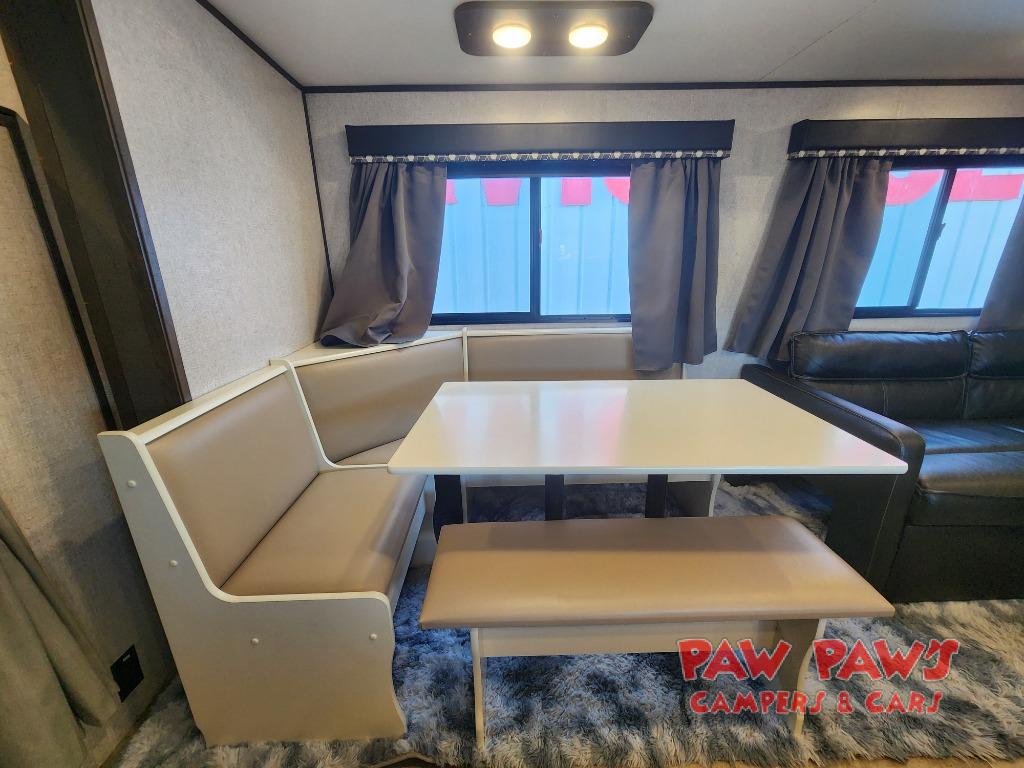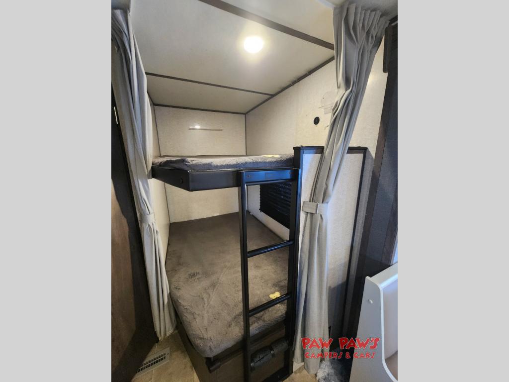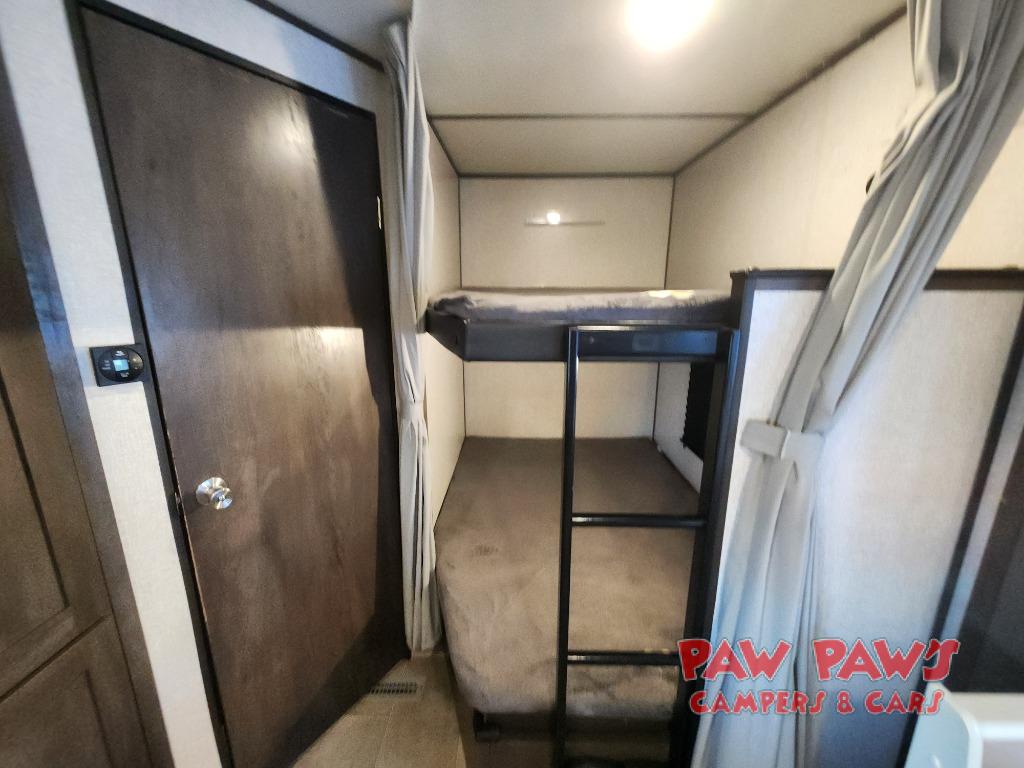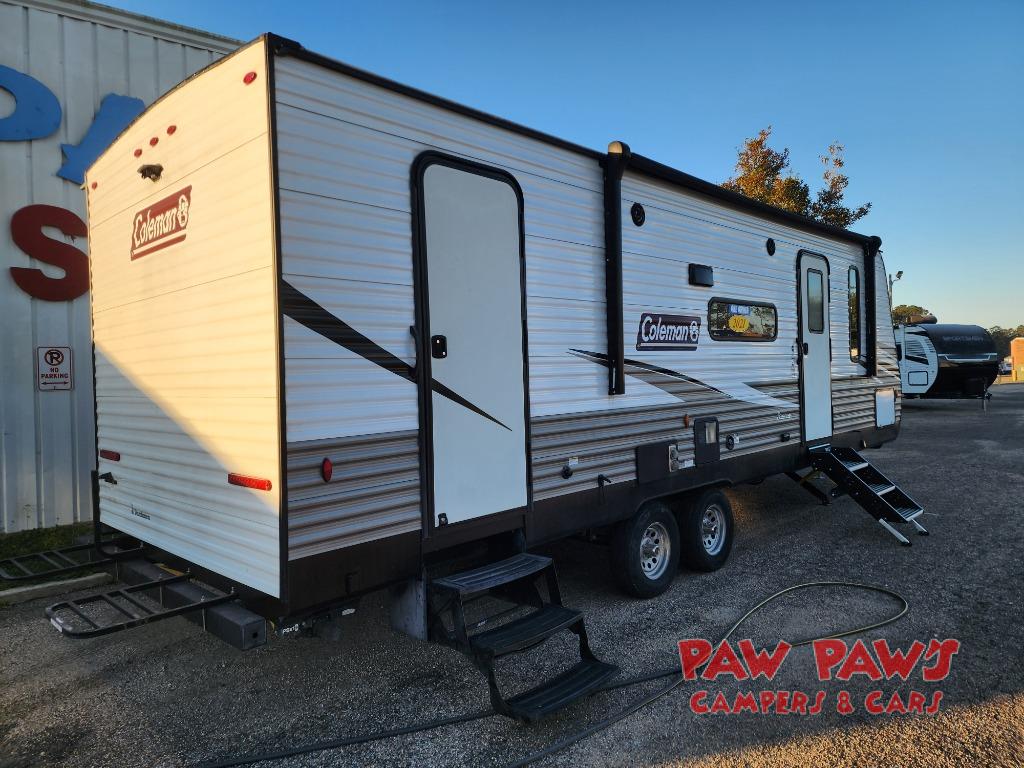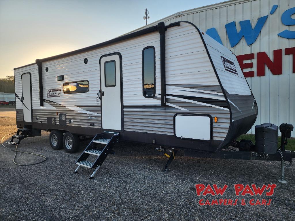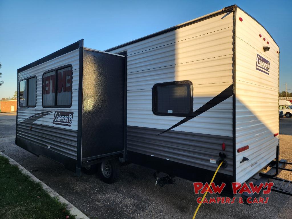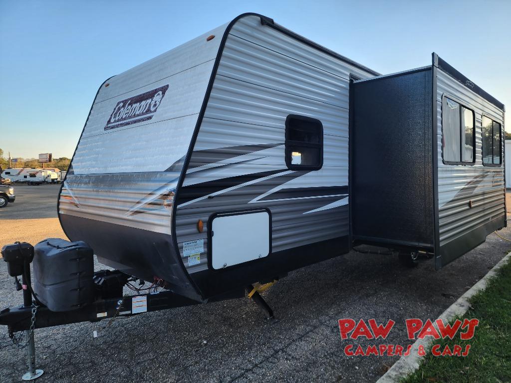 This Coleman Lantern Series travel trailer will provide you and your family with comfort and convenience while you enjoy the great outdoors. You might even meet other RV owners to camp with as well. From having your own private bedroom with wardrobe space and USB power outlet to your kids having double-size bunks, you will not be missing home at all. The cook can make meals while the others take turns getting ready in the full bathroom, and the second exterior entry door into the bathroom is a huge convenience for many reasons. Make this model yours today!