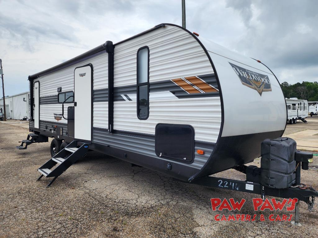 Forest River offers you the highest quality and the best components in its Wildwood travel trailer! The fully walkable one-piece roof is ultra reliable, and the rest of the construction is just as dependable with the powder-coated I-beam frame, cambered chassis, R-7 fiberglass insulation, nitrogen-filled tires, and triple-seal slide-out system. The Wildwood is not only full of quality, but it is also full of style with its herringbone luxury vinyl flooring, shiplap wall board, upgraded designer furniture, high-gloss exterior metal, and seamless countertops. The Wildwood also comes with some extra features that will make your life more comfortable, like the exterior speakers with blue LED light, the tablet-compatible USB ports, the residential vanity with shower caddy, and true stabilizer jacks with JT's Strong Arm.