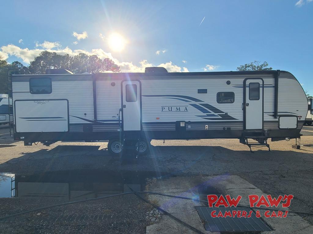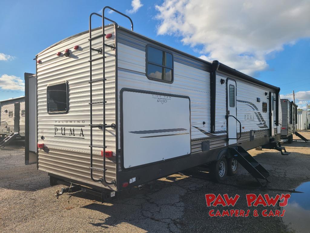 Don't miss out on this decked-out Puma travel trailer! It features two entry doors to promote a smooth flow of traffic in and out of the unit, plus a rear bunkhouse that your kiddos are sure to love. Inside the private bunkhouse there is a sofa for the kids to relax on, two bunk beds, and their very own entertainment center. Making meals will be a breeze in this kitchen with all the appliances, including the stainless steel residential refrigerator for storing your perishables and the pantry for your dry goods. You also have a full bathroom with a 34" x 34" radius shower so that you can get cleaned up after every adventure.
