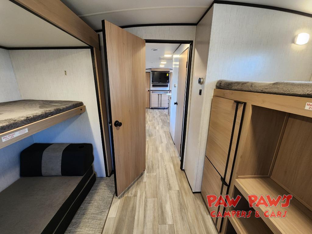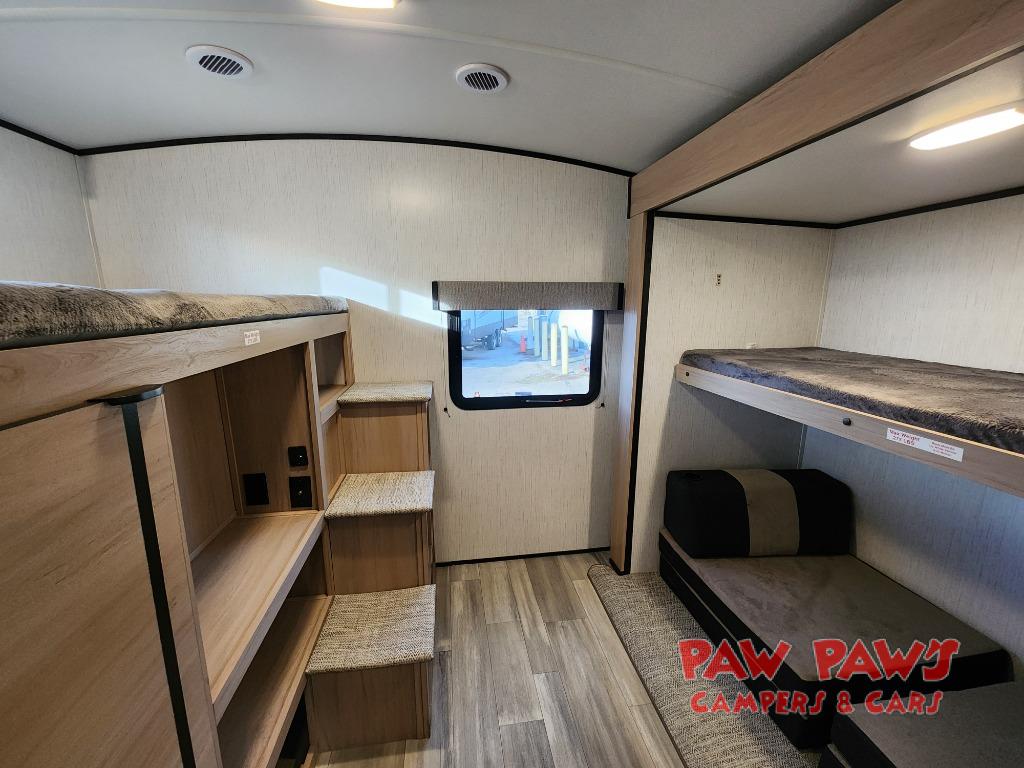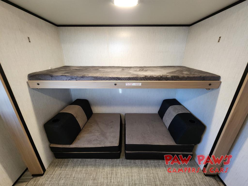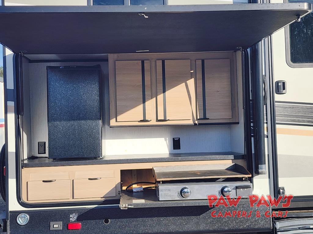 Family vacations and camping trips with friends are made possible in this double slide out trailer. Your guests will have the private bunkhouse to themselves with two bunks, plus a futon to relax on. The chef of your group can take their pick to cook indoors on the three burner cooktop or outdoors on the exterior kitchen, and there is a 19' awning with LED lights for an outdoor living space. When it's time to call it a night, head to the front private bedroom for a great night's rest on the king bed!