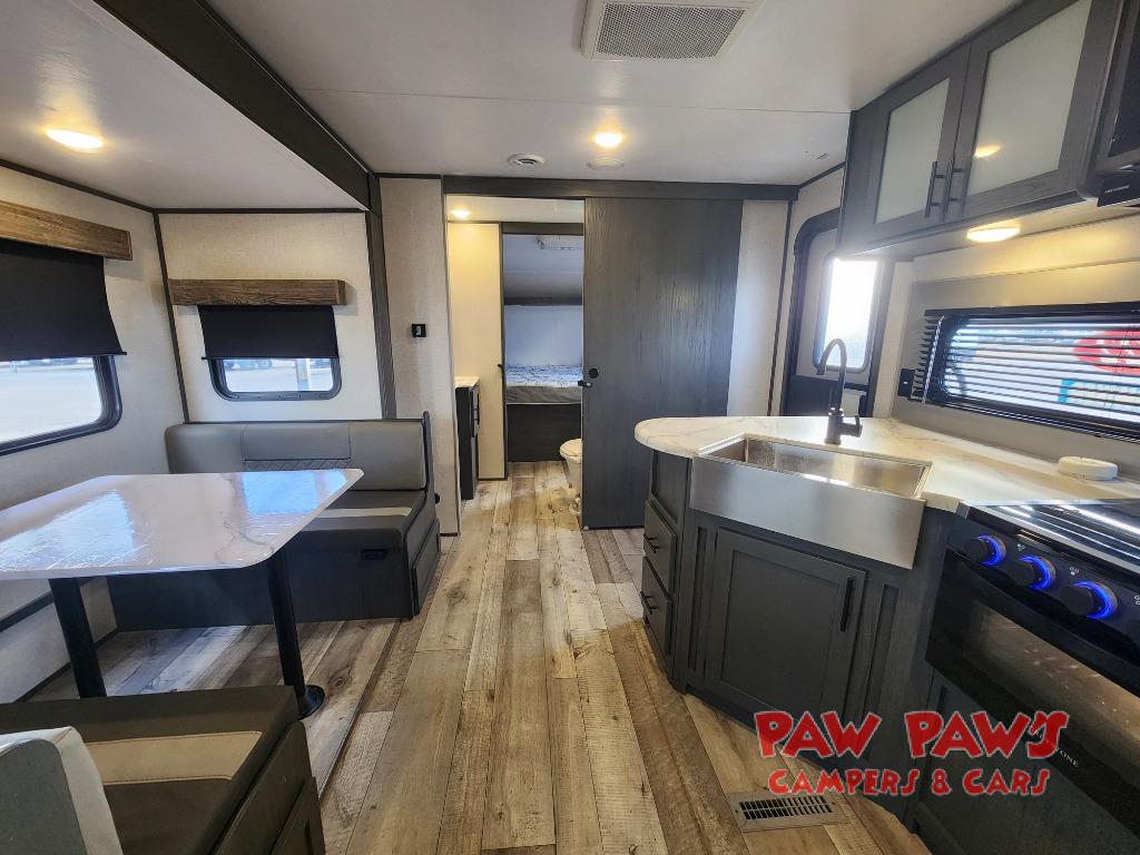 You won't want to camp any other way than in this Aspen Trail travel trailer! The rear private bunkhouse is sure to be a hit with the kiddos, and you will love the front private bedroom with its discreet access into the walk-through bath. The hinged entertainment center makes it easy for anyone to see while sitting on the sofa or U-shaped dinette. Grab your favorite snack from the large pantry and head outdoors while you talk with the chef who is preparing dinner at the outdoor kitchen!