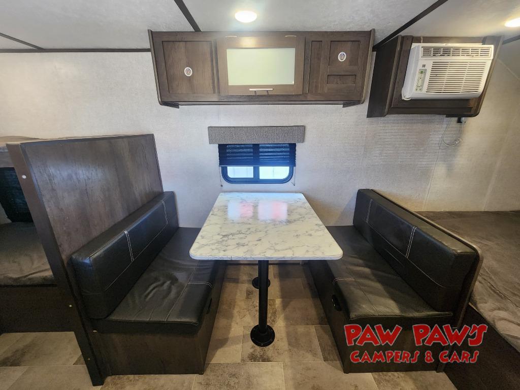 After making dinner on the two burner cooktop or inside the microwave, you can dine at the booth dinette or outside under the 8' power awning if you brought along your camping chairs. Either way you will be comfortable and the dinette may even sleep one person if needed. After playing outdoors all day, everyone can return to get cleaned up in the private toilet and shower room then fall asleep on the queen bed up front or the bunk beds in the rear. And everyone can wake up the next morning to do it over again.