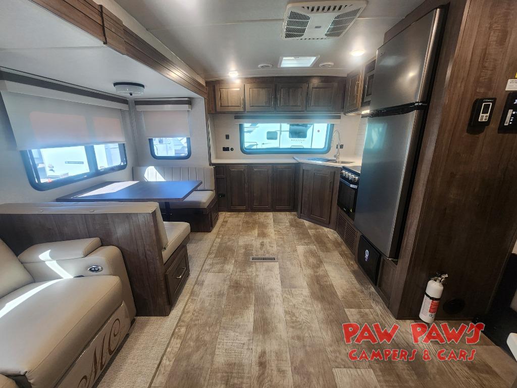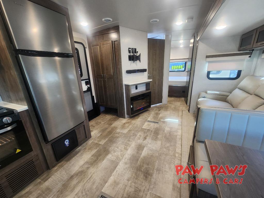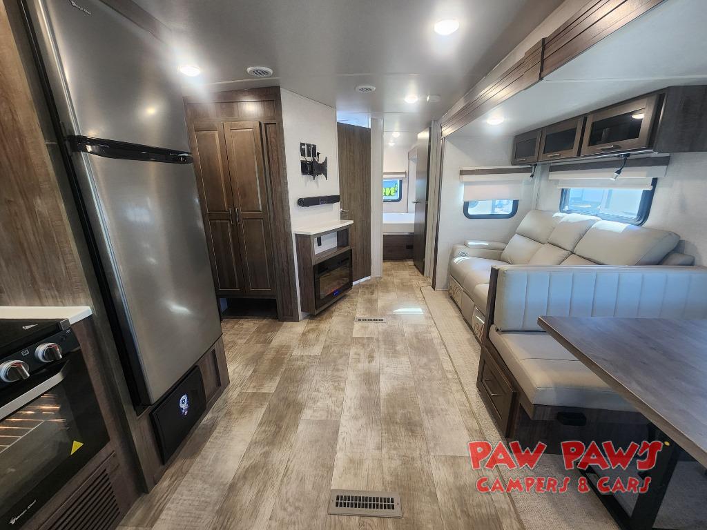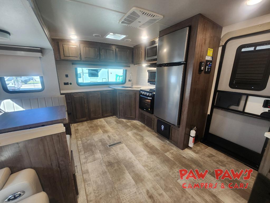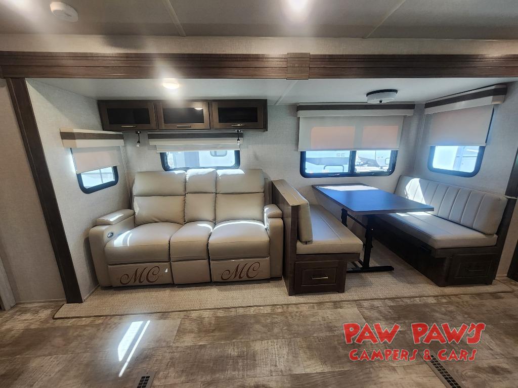 When you are outside this trailer you can enjoy the protection from the 21' power awning, and whip up a meal using the outside griddle. You will find exterior storage for your extra gear, and a ladder on the rear. You get to choose which entrance to step up into, be it the spacious rear bedroom with a queen bed slide and a wardrobe, or the main entry into the kitchen and living area. The furniture slide includes a booth dinette to eat your meals at, and theater seating to watch the LED TV with fireplace below. And the cook will love the front kitchen with extra counter space, and the appliances are nearby to make warm meals, and the pantry is next to the entry allowing you to grab a snack on your way out for a hike.
