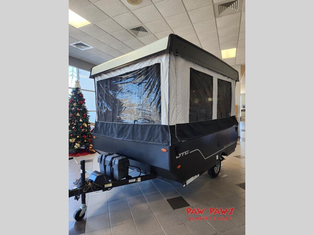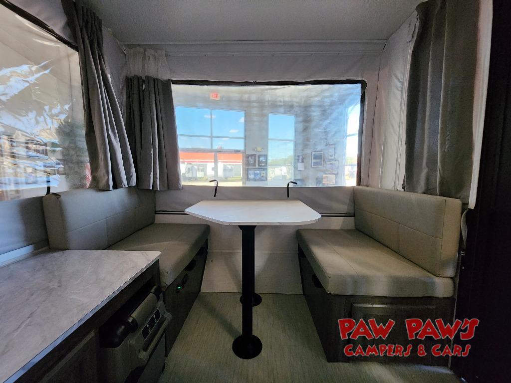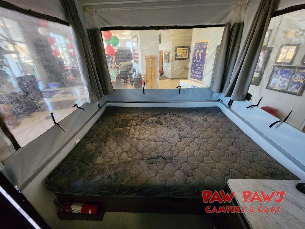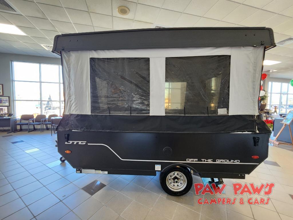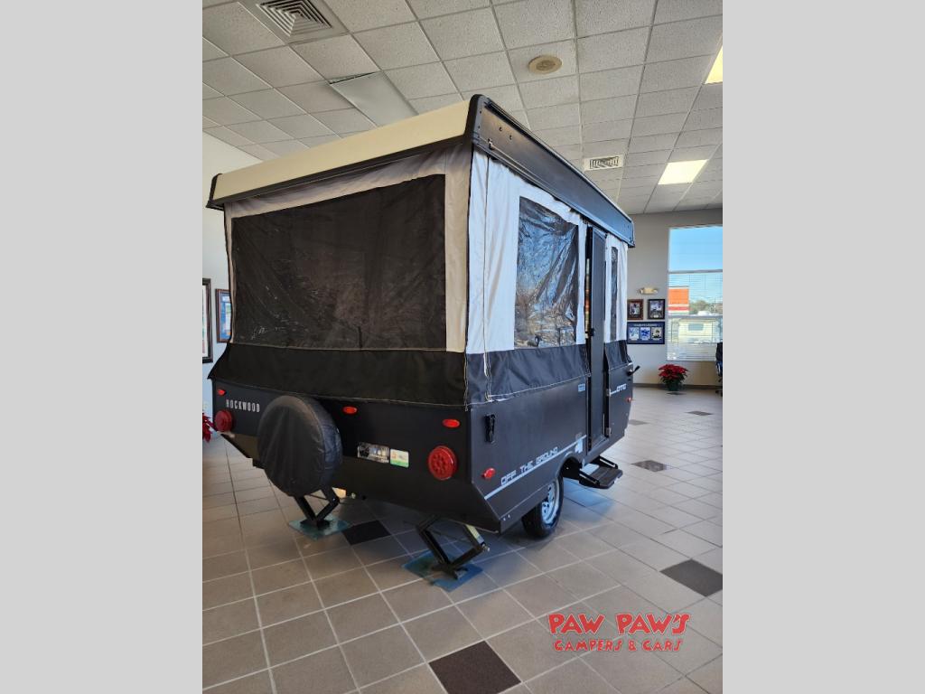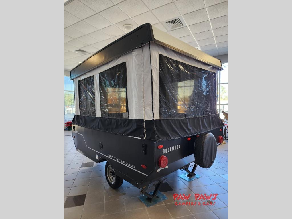 With any Rockwood OTG (Off The Ground) folding pop-up camper by Forest River, you will enjoy a more simple approach to outdoor fun. If you're a regular tent camper, but are looking for a little more comfort, then take a look at these easy-to-tow models! There are electric brakes, nitrogen filled tires, and leaf spring axles that provide that easy towing, and the black exterior is sure to be eye-catching. A one-piece screen door also comes standard so you can let fresh air in, while keeping bugs out, and the LED interior lights will be an added benefit you didn't have while tent camping. Each model also includes residential style cabinet doors, wood look flooring, and an Autumn Wood interior for a more outdoorsy feel!