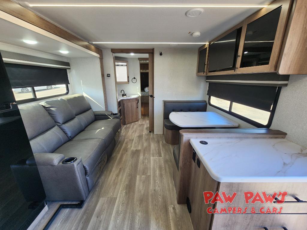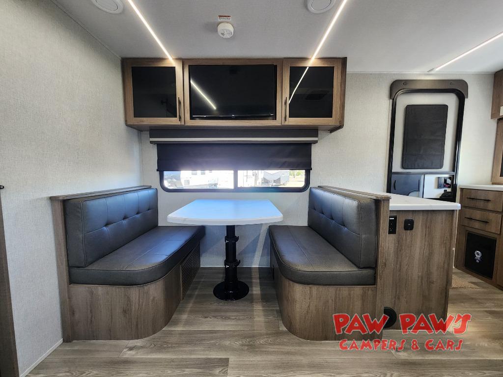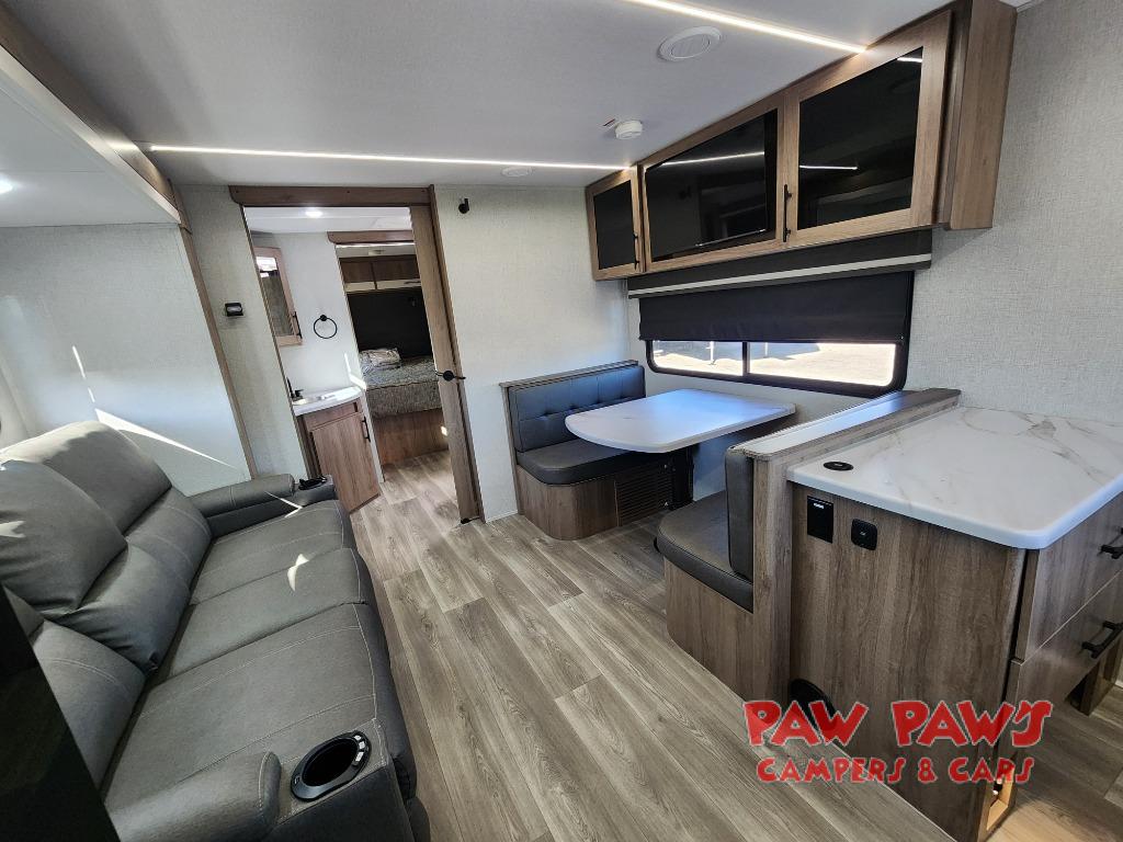 Treat yourself to a weekend of fun in this Imagine XLS travel trailer! Whether it's just you and your spouse, or you've chosen to bring along a group of friends, this trailer will meet the need. The front bedroom can sleep two people on the walk-around queen-size bed. The bedroom is quite functional because it not only contains the second exterior entry door, but it also has a private entrance into the walk-through bathroom since it is located on the other side of the bathroom. The booth dinette is functional too because it can transform from a dining location into a sleeping location, and the theater seating is directly across from the LED TV for easy viewing.